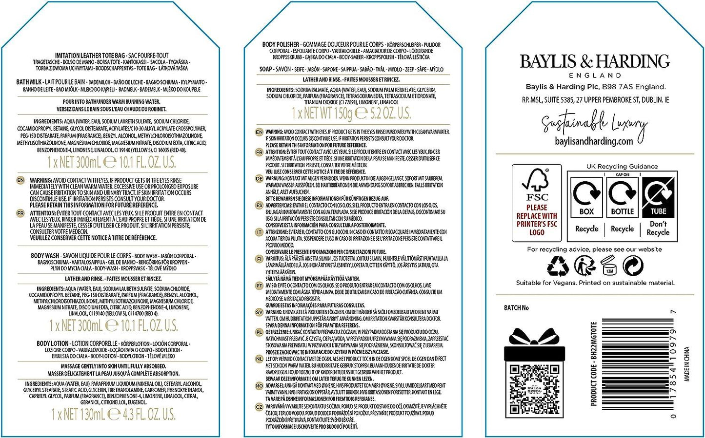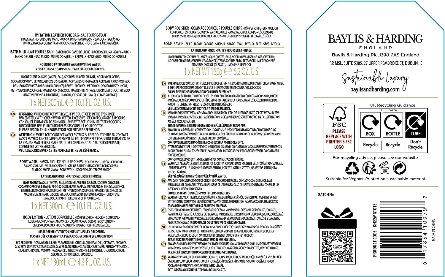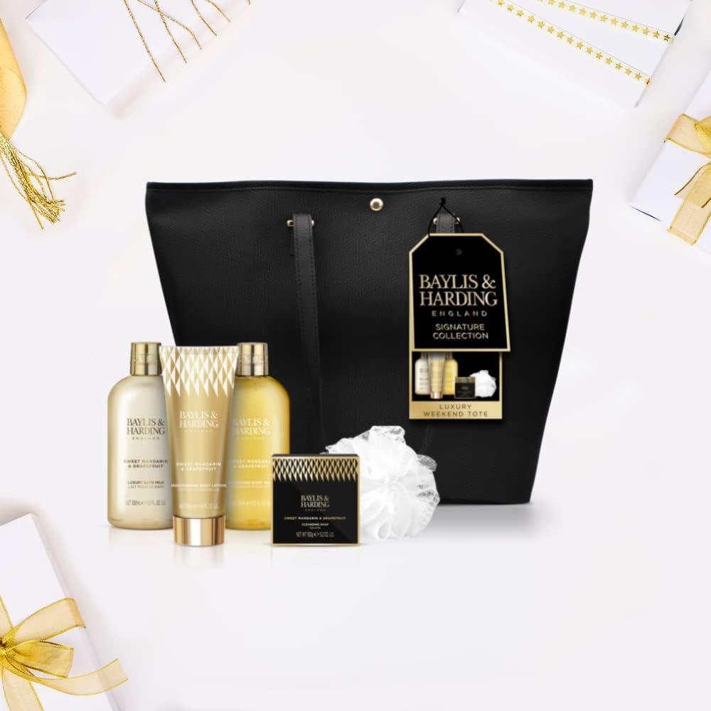 Directional design meets timeless luxury with our enduring Sweet Mandarin & Grapefruit collection. Our most iconic fragrance, composed with elegant jasmine and layered with sparkling citrus top notes brings a luxe dimension to this classic assortment. Coupling contemporary geometric prints with chic foil accents to create masterfully modern seasonal gifts.All of your luxury travel essentials are presented in this beautifully stylish tote bag. It contains 300ml bath milk, 300ml body wash, 150g soap, 130ml body lotion and a body polisher.Founded in 1970 in the Heart of England, Baylis & Harding is a family business which has grown from humble beginnings to become an award winning, international success. Beautifully made, beautifully packaged and beautifully fragranced, Baylis & Harding create gifts that are opened with delight and products to make both you and your home feel more wonderful.