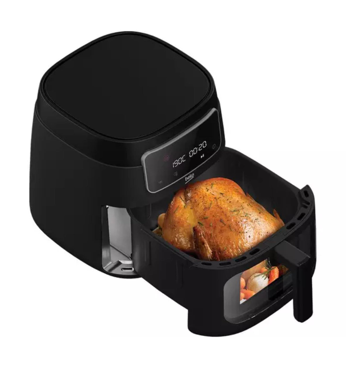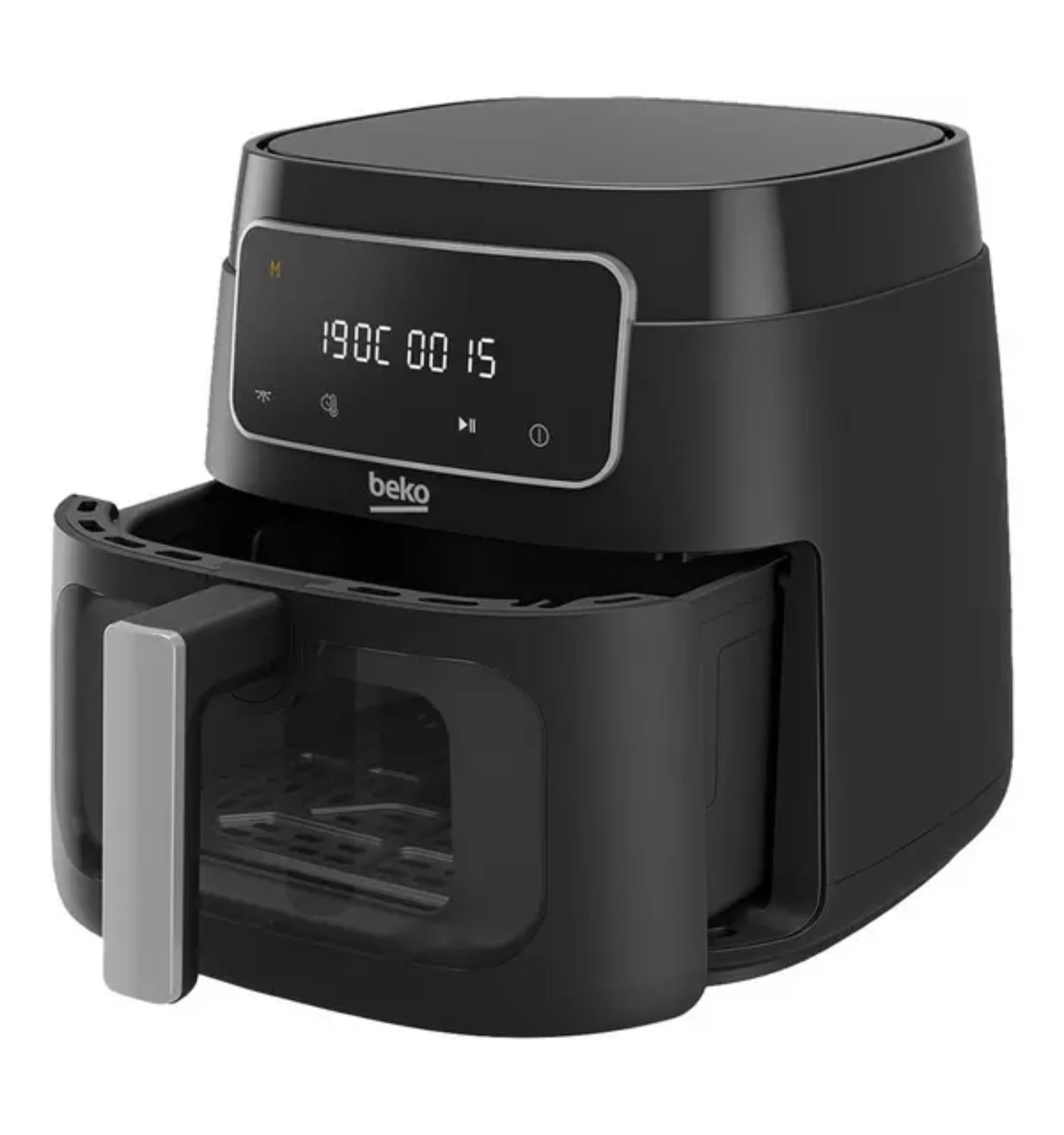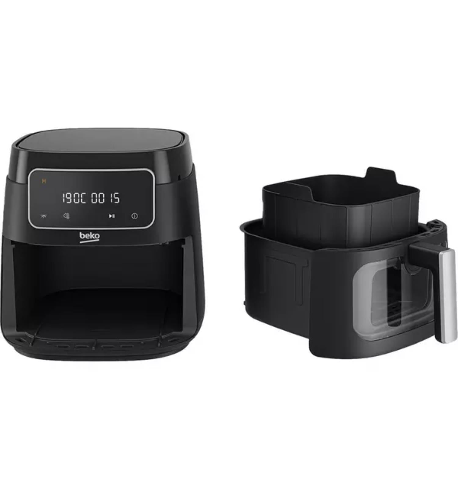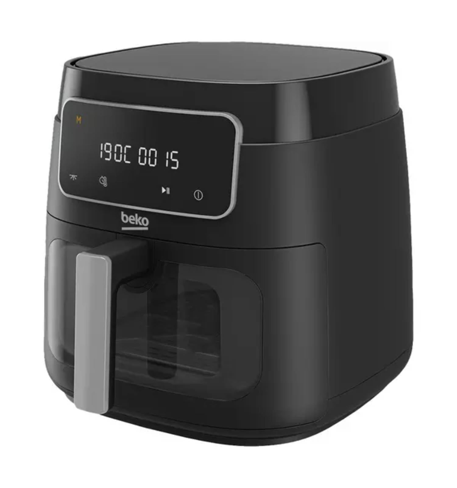 Enjoy home-cooked fried meals without all the guilt. This Beko Air Fryer needs just 1 spoonful of oil to make your fried favourites all crispy, yummy and healthy. It's got a clear glass front and light so you can keep an eye on your grub while it's cooking. And with it's generous 7.6 litre capacity, you can whip up enough crispy chips to feed a clan. Not much of a chef? Its 9 auto-cook functions are on hand to help. With an adjustable time and temperature, your chicken will get that perfect golden roast. Easily choose options and change the settings thanks to its wide LED display and touch controls. Once you're all fed, simply pop the cooking rack or grill into the dishwasher for an easy clean-up.