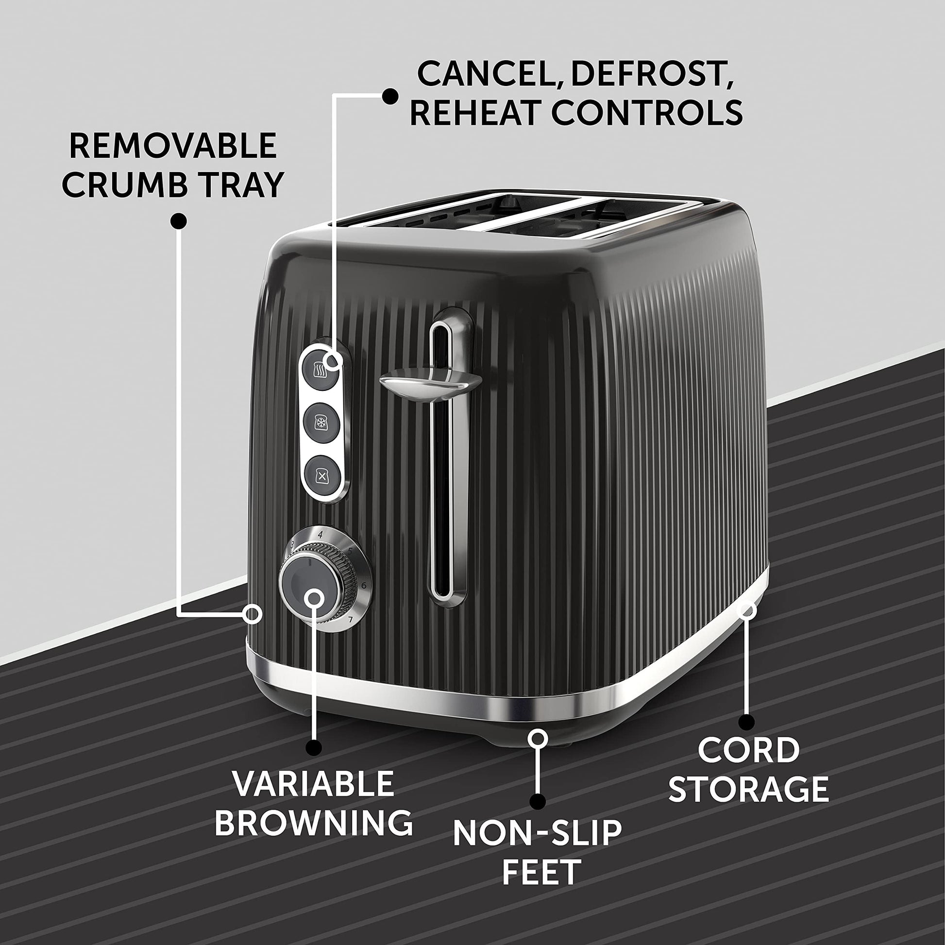 Defrost, reheat and mid-cycle cancel functions, plus removable crumb tray, non-slip base and cord storage