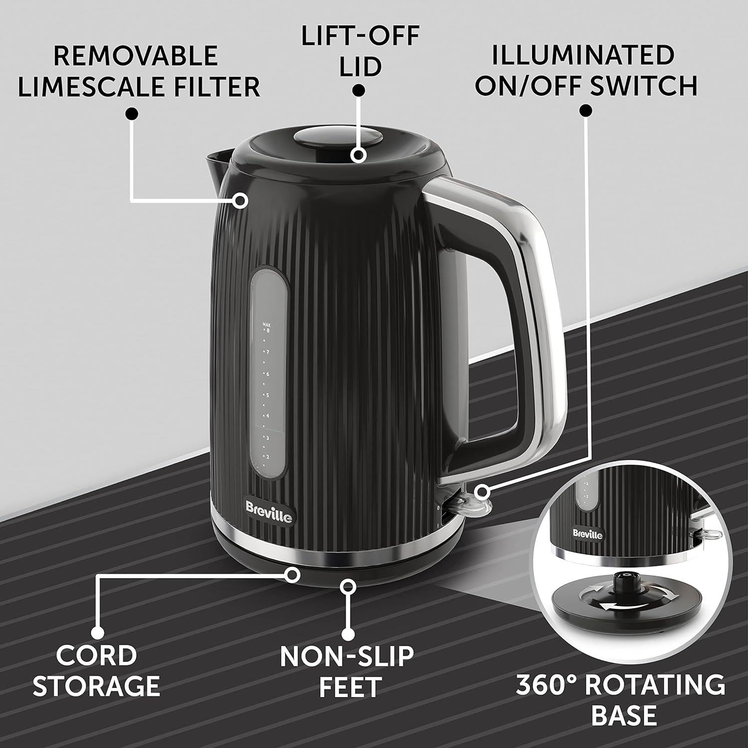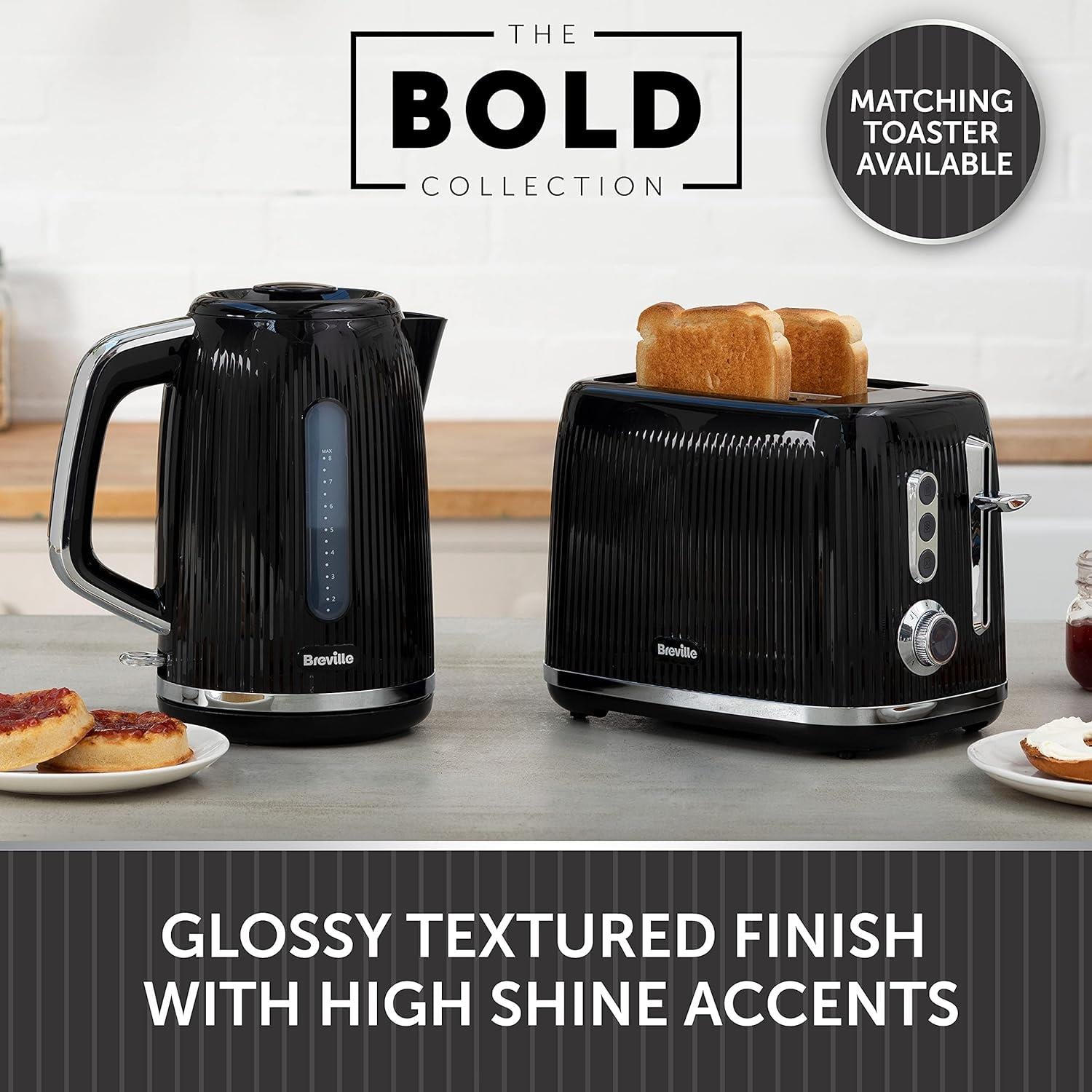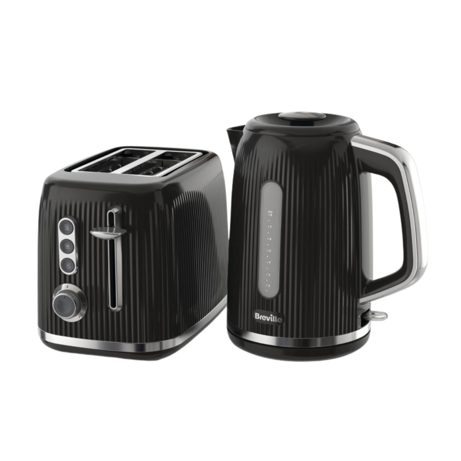 Breville Bold Black Breakfast Bundle contains a 1.7L Kettle and 2 Slice Toaster. This Bold kettle and toaster set has a glossy, ridged textured finish with high shine chrome accents and illuminated controls for ease of use. The kettle has a 3kW concealed element for rapid boiling; 1.7 Litre capacity makes 6 to 8 cups. Rear water window for accurate filling and energy efficient boiling; extra wide spout for easy pouring. Removable, cleanable limescale filter; concealed element for easy cleaning. 360-degree rotational base, lift off lid, non-slip feet and cord storage.The toaster has variable width bread slots allow for both thick and thin slices. Variable browning control lets you pick your preferred shade of golden brown. Lift and Look function lets you check your toast mid-cycle; High Lift feature means smaller items can be removed easily without burning fingers. Defrost, reheat and mid-cycle cancel functions, plus removable crumb tray, non-slip base and cord storage.