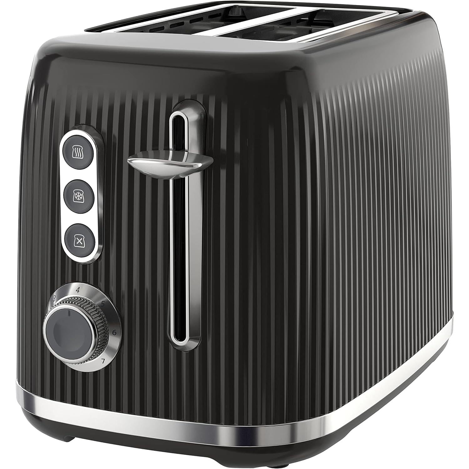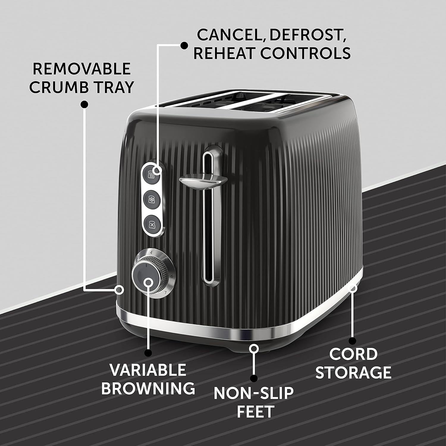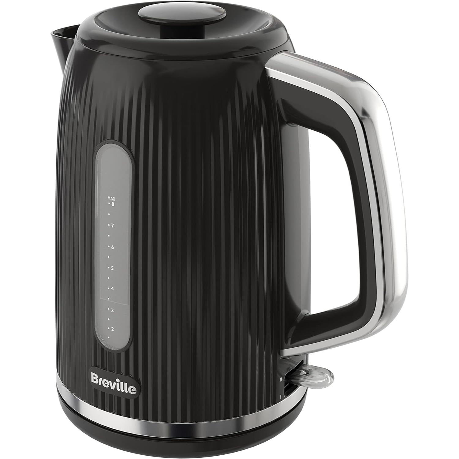 Breville Bold Black Breakfast Bundle contains a 1.7L Kettle and 2 Slice Toaster. This Bold kettle and toaster set has a glossy, ridged textured finish with high shine chrome accents and illuminated controls for ease of use. The kettle has a 3kW concealed element for rapid boiling; 1.7 Litre capacity makes 6 to 8 cups. Rear water window for accurate filling and energy efficient boiling; extra wide spout for easy pouring. Removable, cleanable limescale filter; concealed element for easy cleaning. 360-degree rotational base, lift off lid, non-slip feet and cord storage.The toaster has variable width bread slots allow for both thick and thin slices. Variable browning control lets you pick your preferred shade of golden brown. Lift and Look function lets you check your toast mid-cycle; High Lift feature means smaller items can be removed easily without burning fingers. Defrost, reheat and mid-cycle cancel functions, plus removable crumb tray, non-slip base and cord storage.