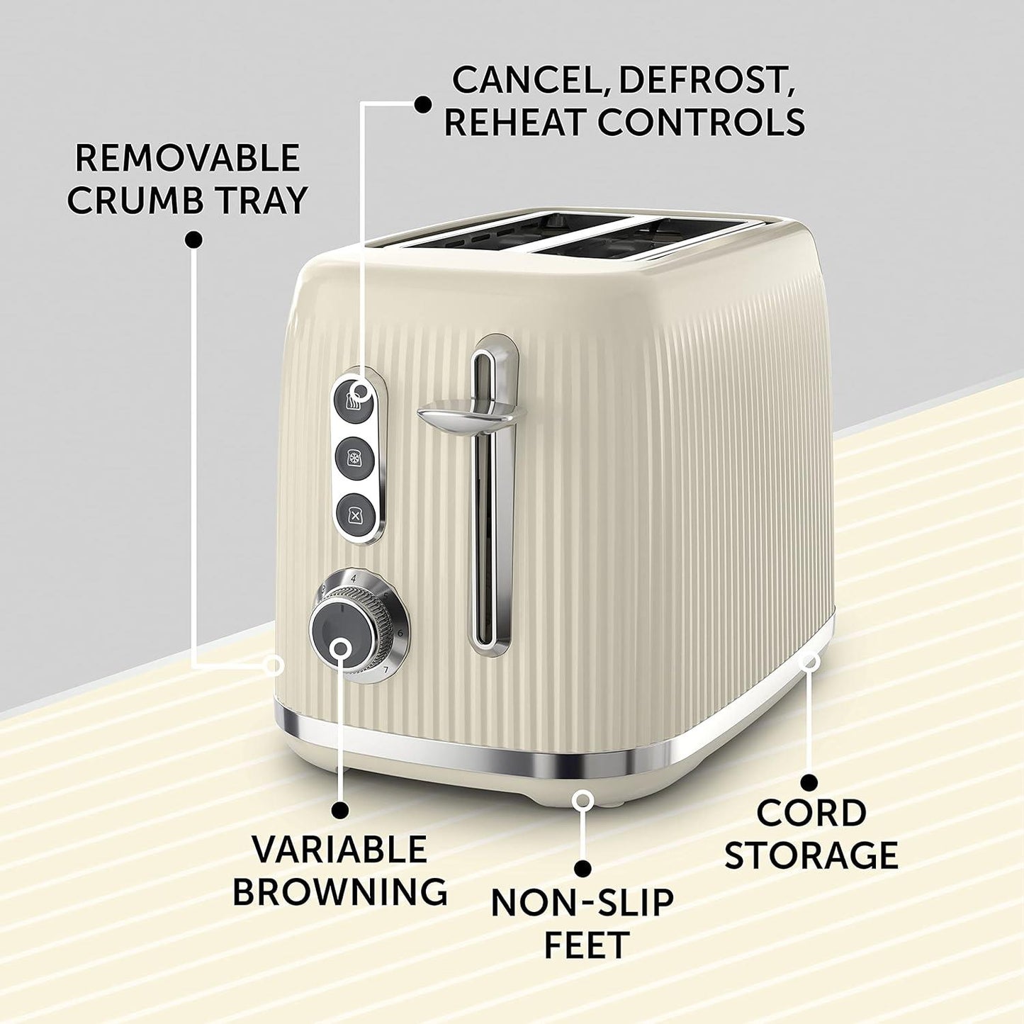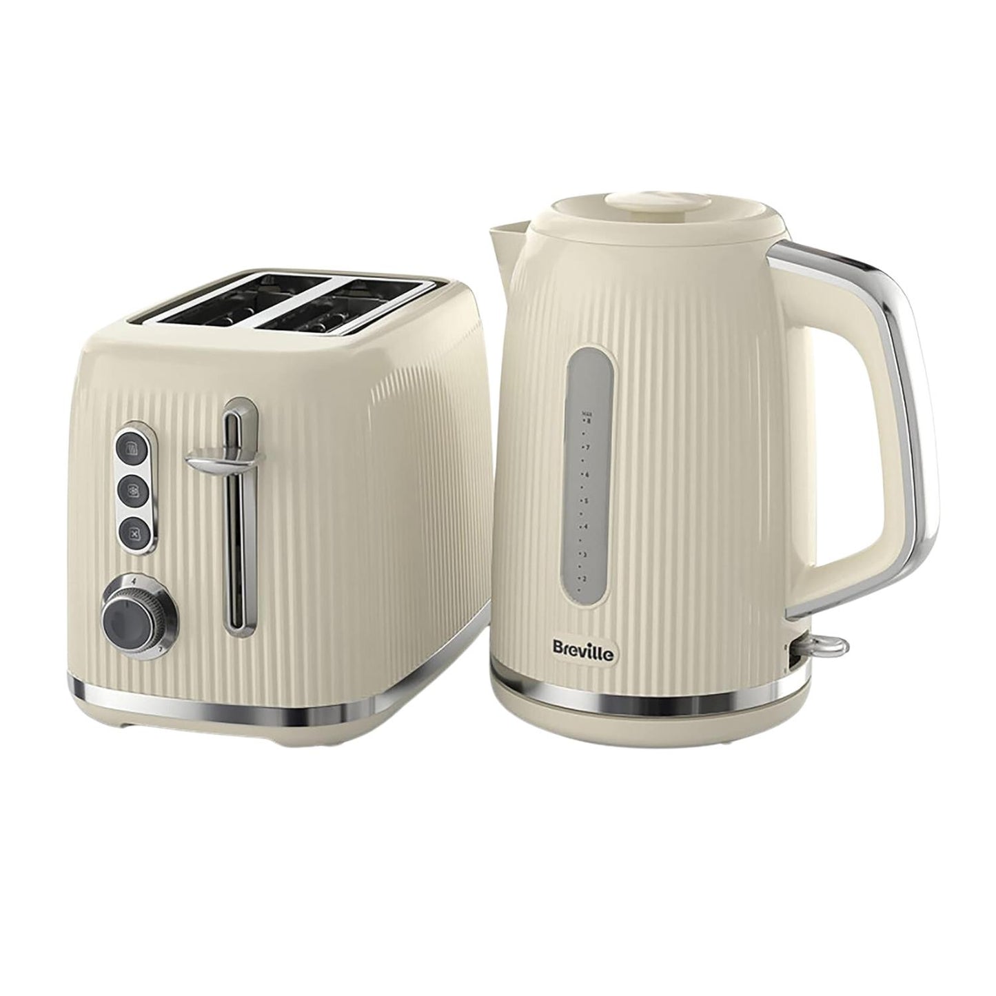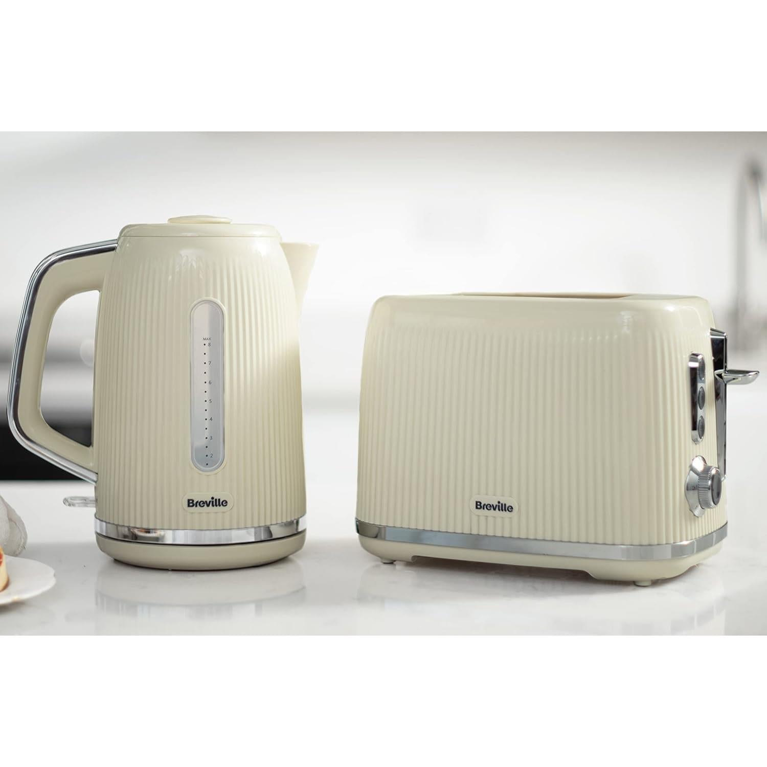 Breville Bold Cream Breakfast Bundle contains a 1.7L Kettle and 2 Slice Toaster. This Bold kettle and toaster set has a glossy, ridged textured finish with high shine chrome accents and illuminated controls for ease of use. The kettle has a 3kW concealed element for rapid boiling; 1.7 Litre capacity makes 6 to 8 cups. Rear water window for accurate filling and energy efficient boiling; extra wide spout for easy pouring. Removable, cleanable limescale filter; concealed element for easy cleaning. 360-degree rotational base, lift off lid, non-slip feet and cord storage.The toaster has variable width bread slots allow for both thick and thin slices. Variable browning control lets you pick your preferred shade of golden brown. Lift and Look function lets you check your toast mid-cycle; High Lift feature means smaller items can be removed easily without burning fingers. Defrost, reheat and mid-cycle cancel functions, plus removable crumb tray, non-slip base and cord storage.