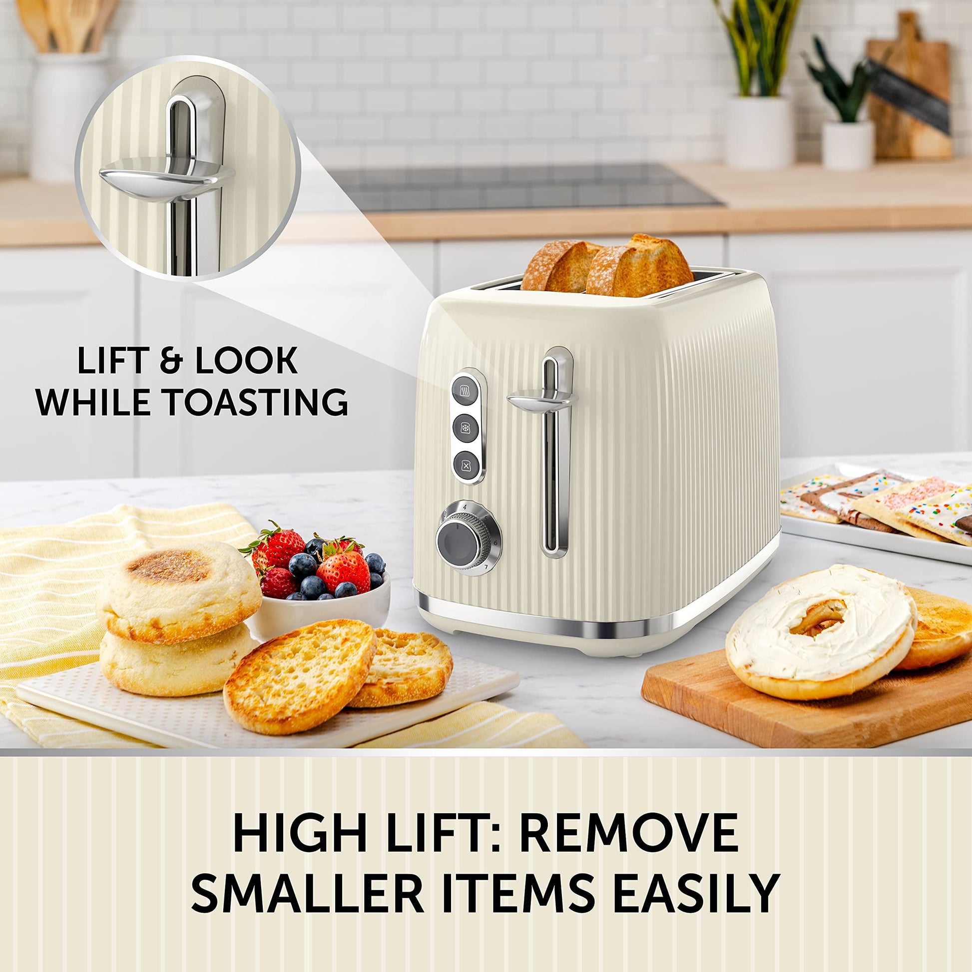 Lift and Look function lets you check your toast mid-cycle; High Lift feature means smaller items can be removed easily without burning fingers