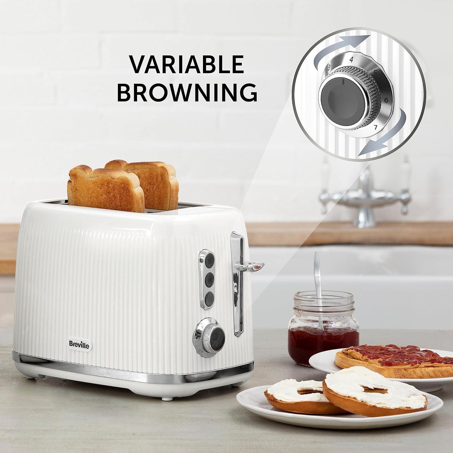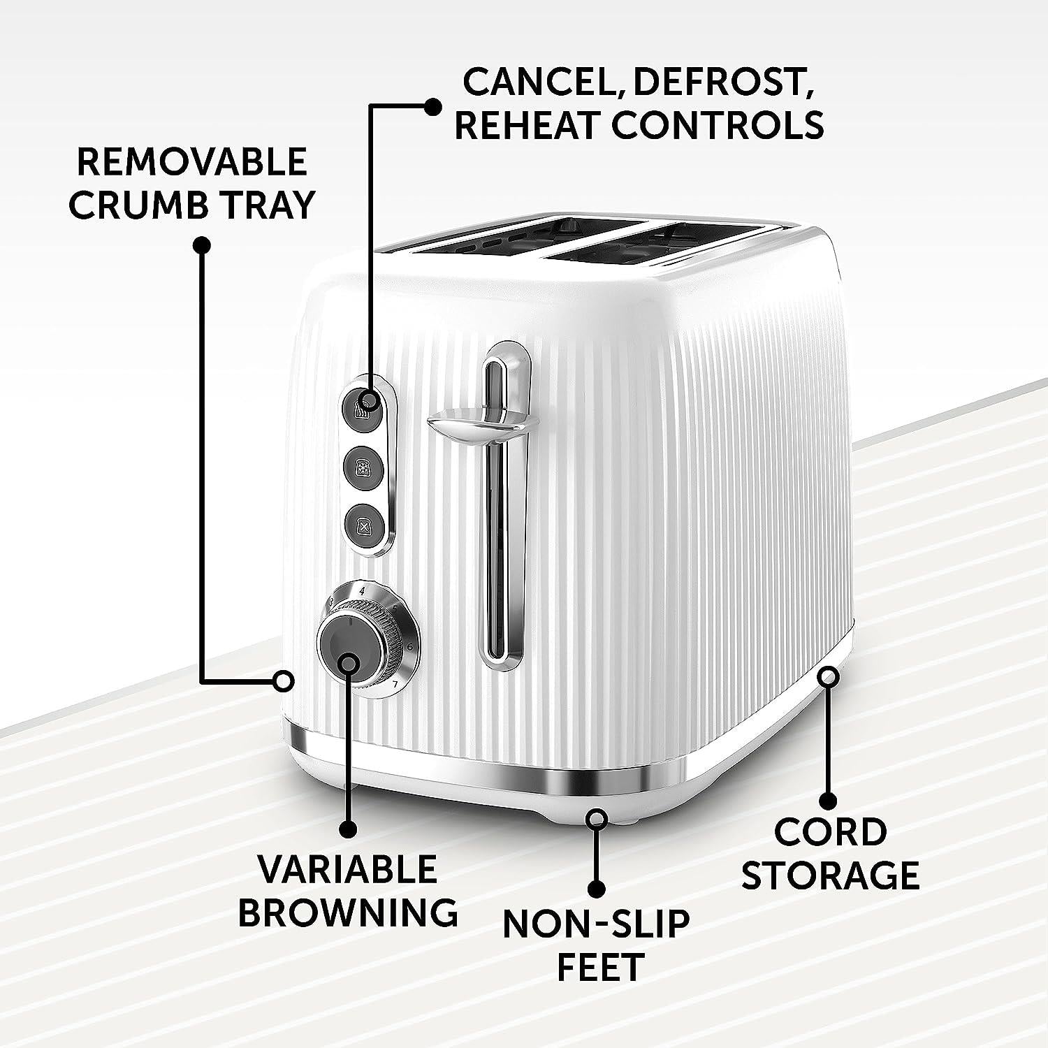 The stylish design features a glossy ridged textured finish with high shine chrome accents and illuminated controls for ease of use. Variable width slots and browning controls ensure bread, crumpets or bagels are just the way you like them. The large 1.7 Litre capacity boils up to 8 cups at once. A removable, washable limescale filter keeps water clean and clear. Add some shine to your kitchen while also keeping it clean and tidy with cord storage and removable crumb tray.