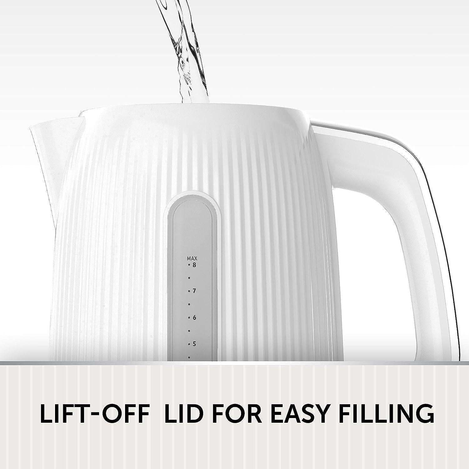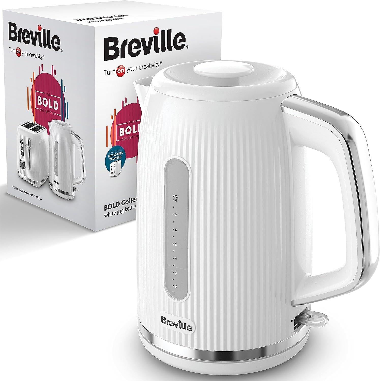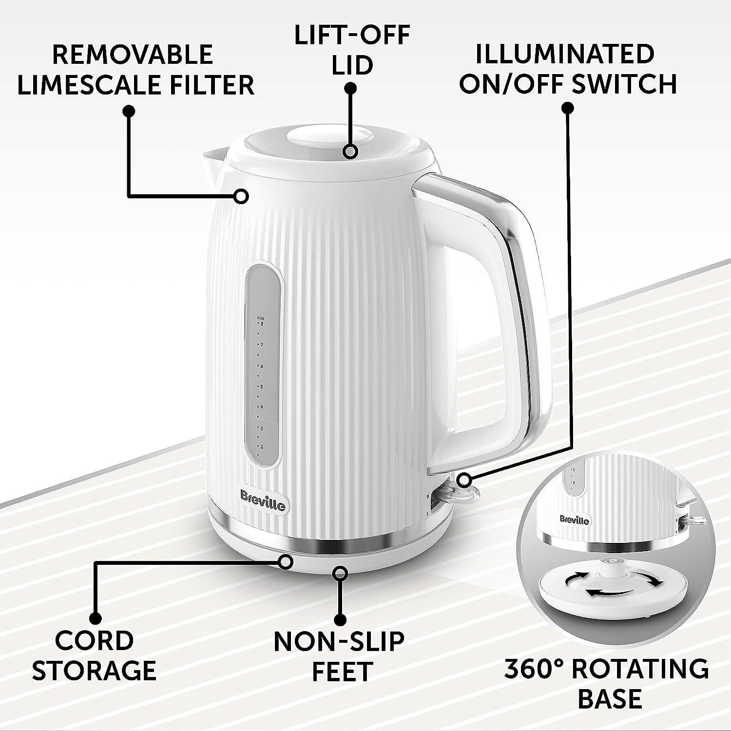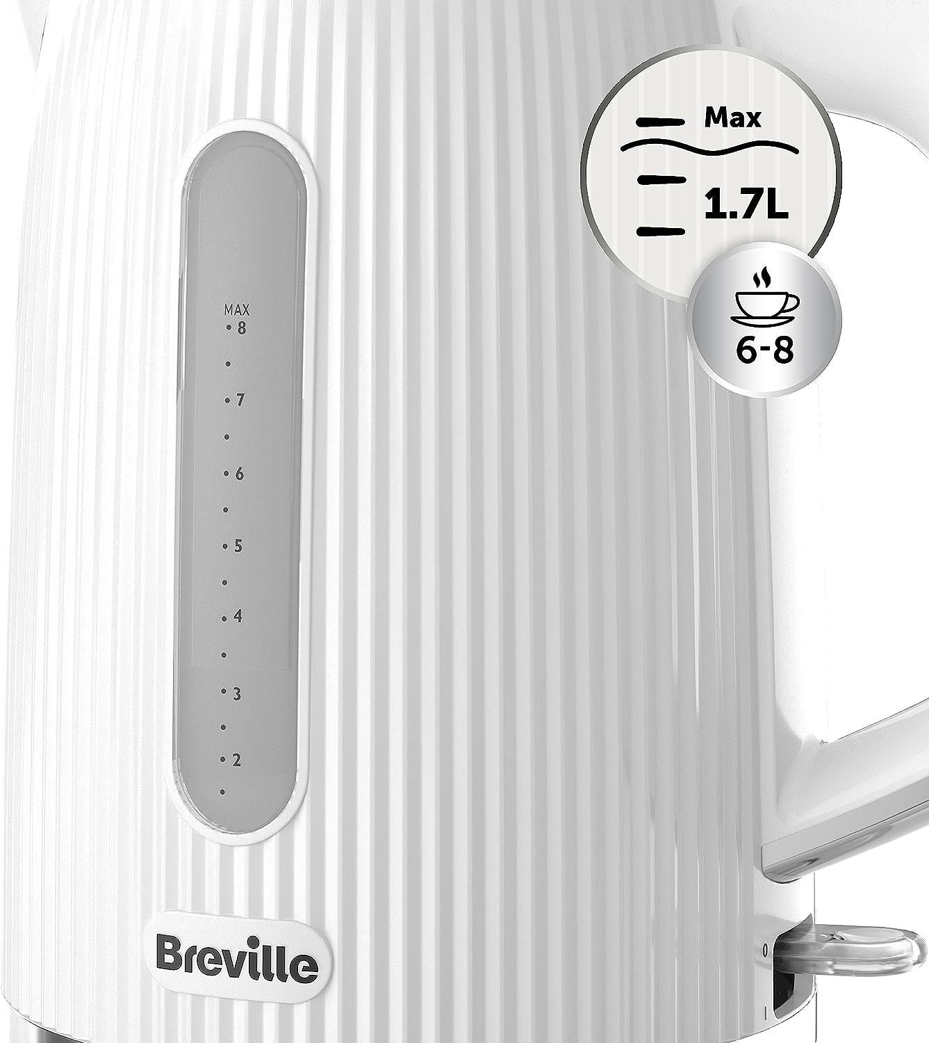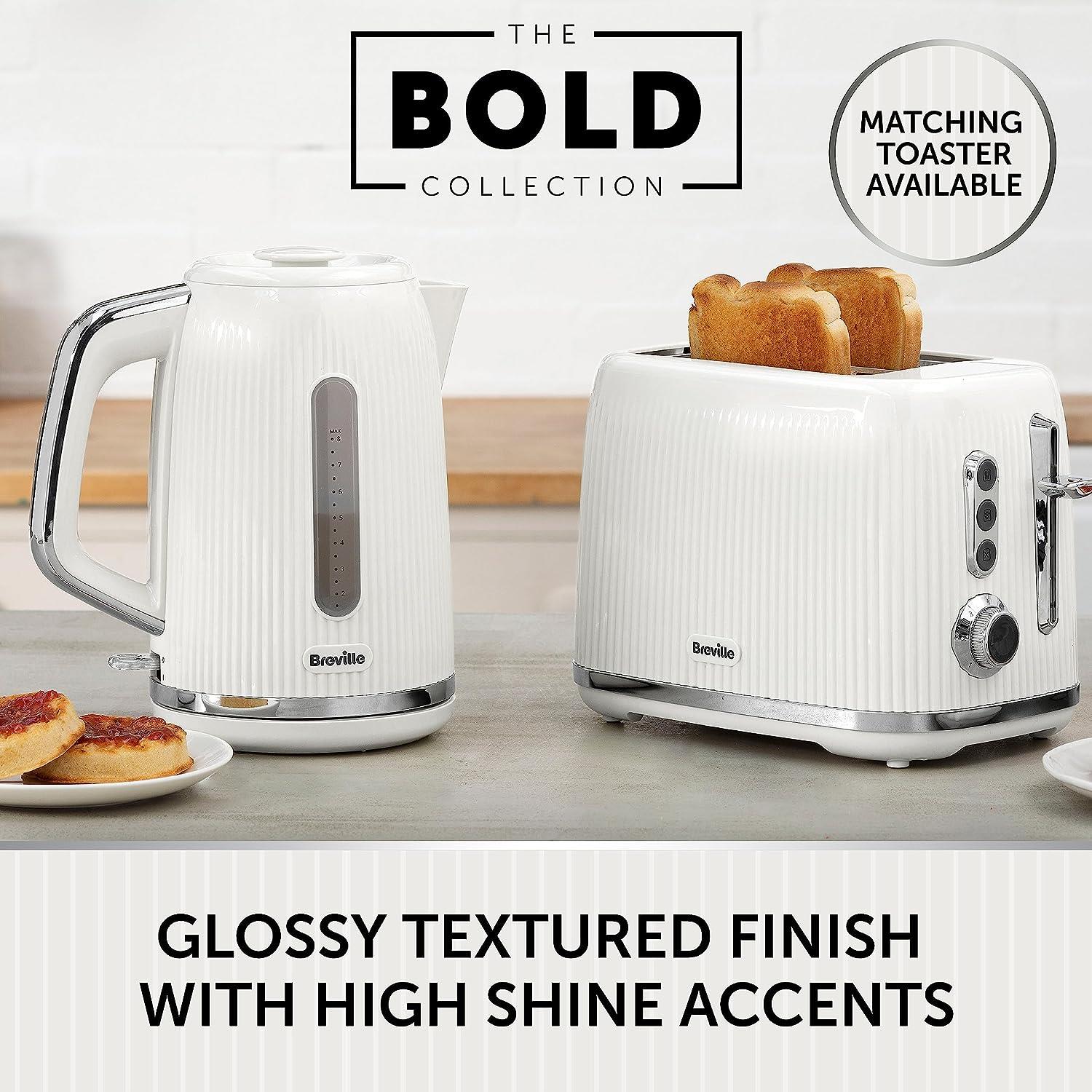 The stylish design features a glossy ridged textured finish with high shine chrome accents and illuminated controls for ease of use.The large 1.7 Litre capacity boils up to 8 cups at once. A removable, washable limescale filter keeps water clean and clear. 3kW concealed element for rapid boiling; 1.7L capacity makes 6 to 8 cups. Water window and wide spout make accurate filling and pouring easy. Removable, cleanable limescale filter; concealed element for easy cleaning. 360-degree rotational base, lift off lid, non-slip feet and cord storage. Complete your white kettle and toaster set with the matching Bold toaster.