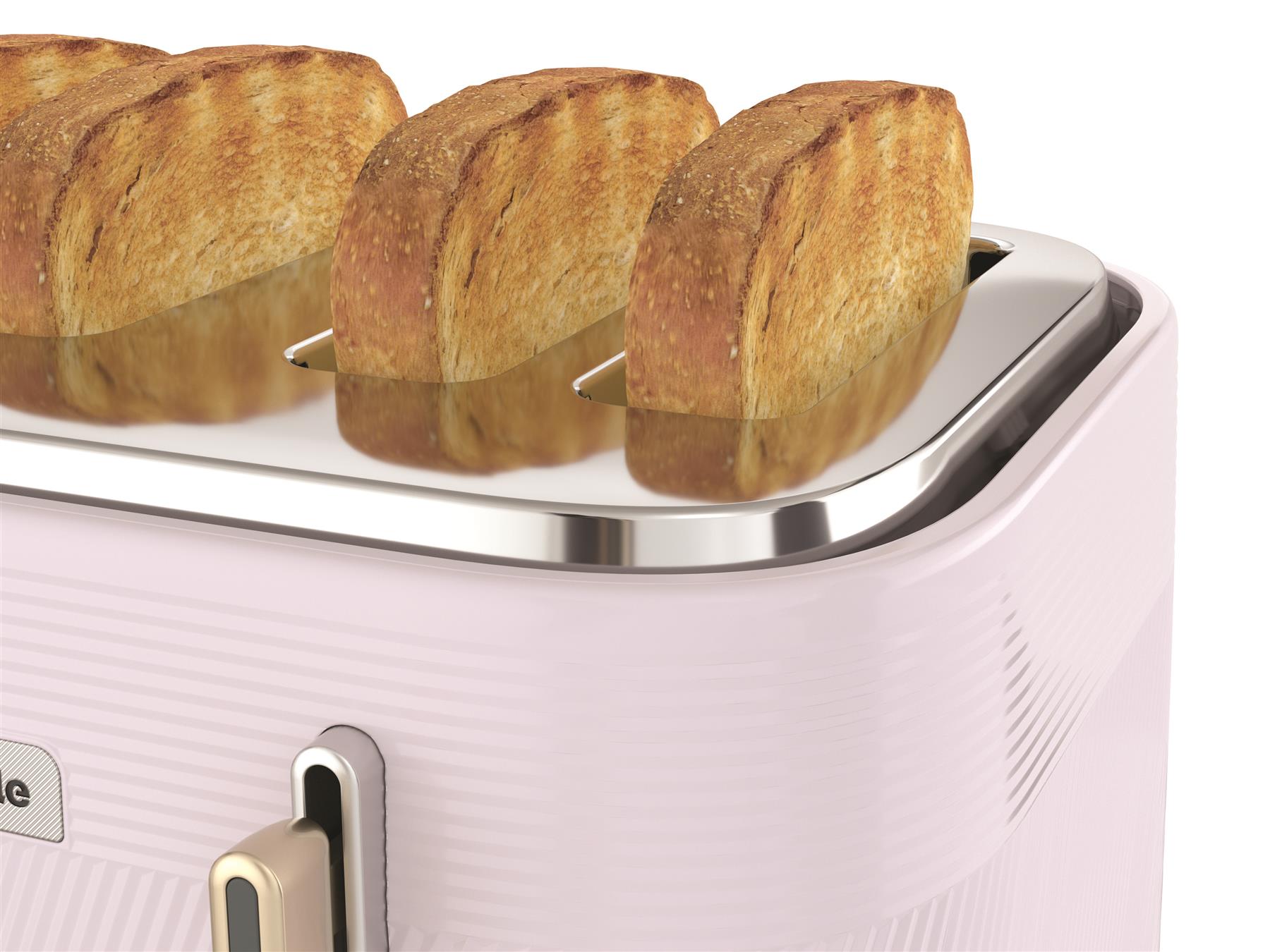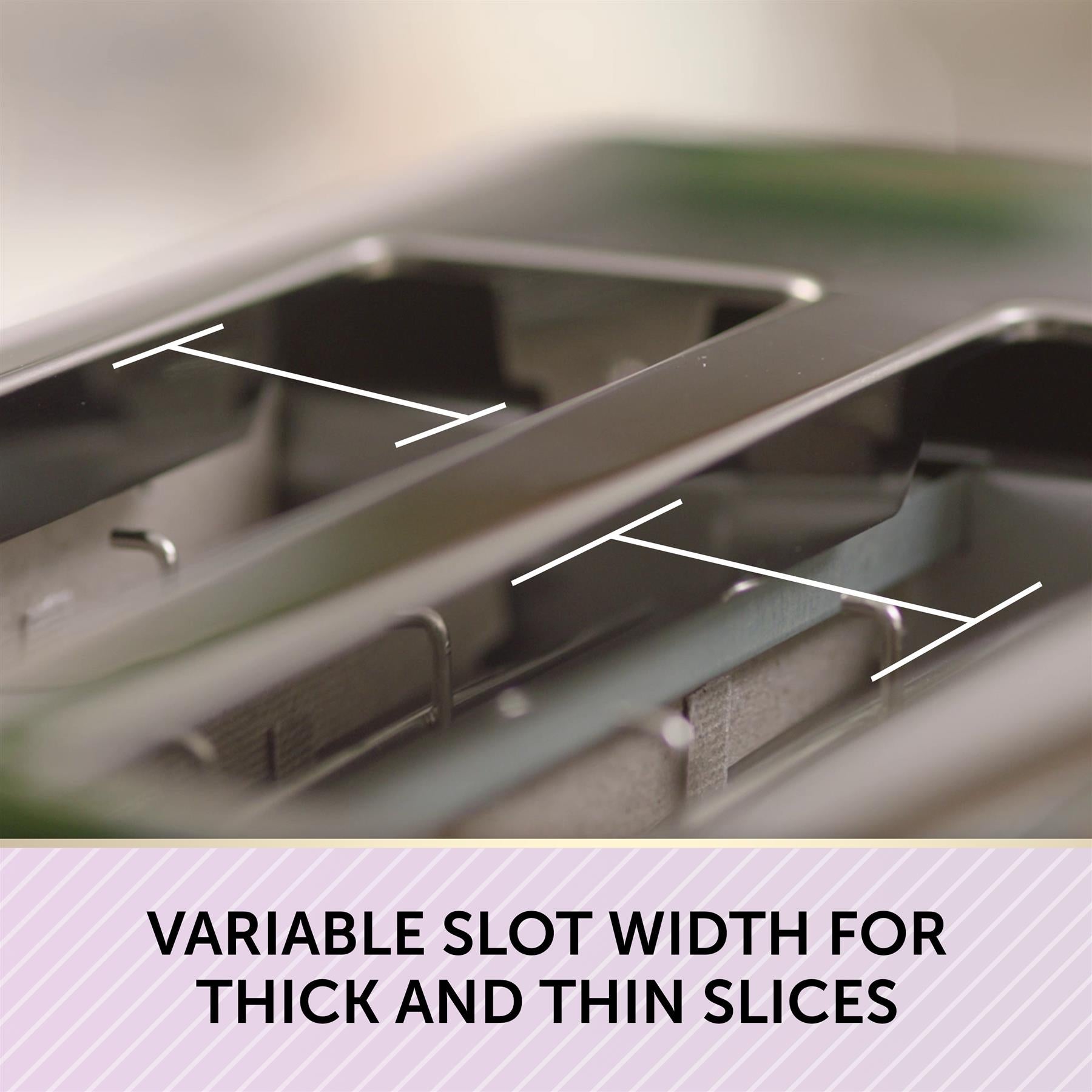 Like your toast lightly golden or extra crunchy? This toaster's got your back with variable browning levels. Toast straight from the freezer with the defrost function, or use the reheat button to warm up a slice that's gone cold. 4 extra wide slots can fit thick and chunky slices of bread perfect for hungry households.The high lift eject lets you safely take out smaller pieces of bread with just one simple push no more burnt fingers. It has a slide-out crumb tray to help keep your worktop tidy. Lilac & Gold, Defrost function, Reheat function, Extra-wide slots, High-lift eject.