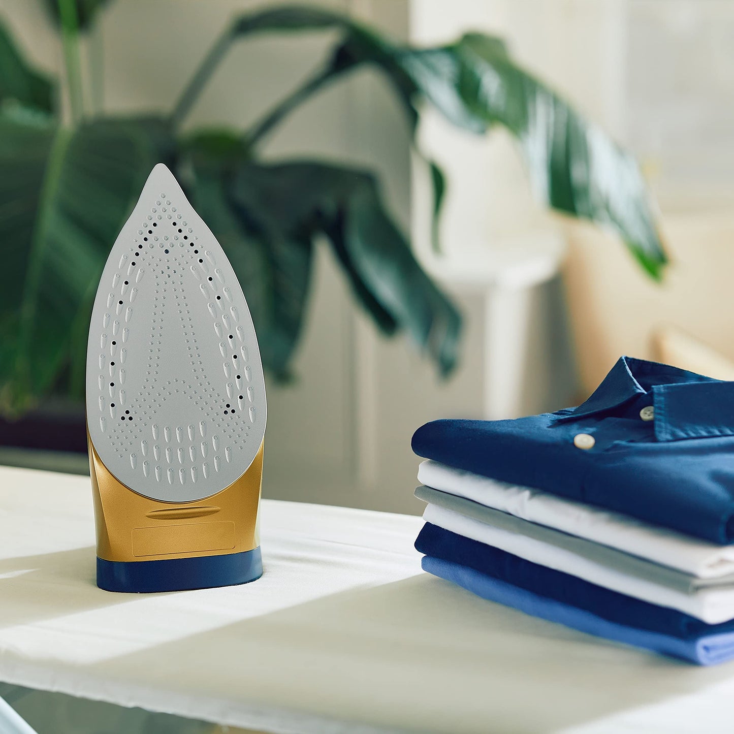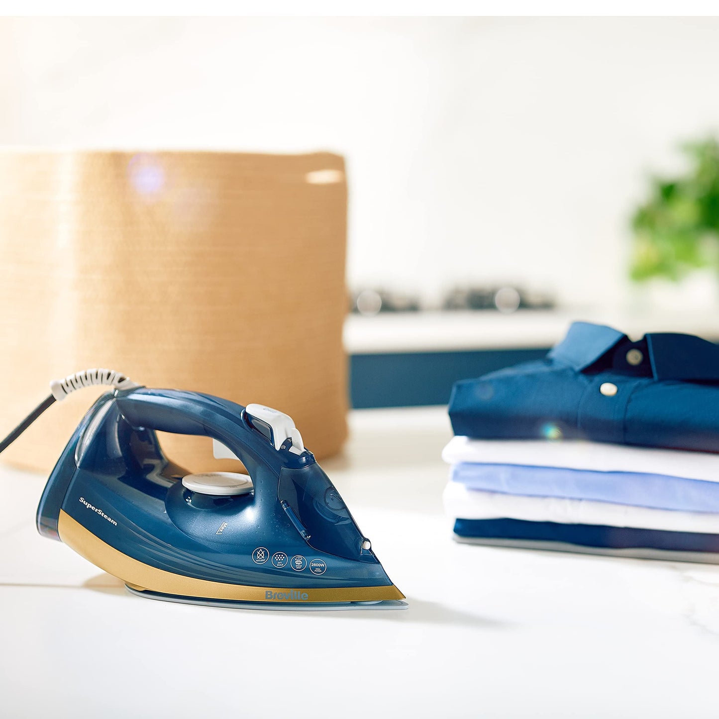 Crafted with deep navy and polished brass, this steam iron brings a touch of style to your chores, as well as 40g/min variable steam and a powerful 190g/min steam shot to tackle even the toughest creases. As well as great performance, the SuperSteam iron boasts a variety of features designed to make your life easier like the Safe-Store heat indicator and self-cleaning function.