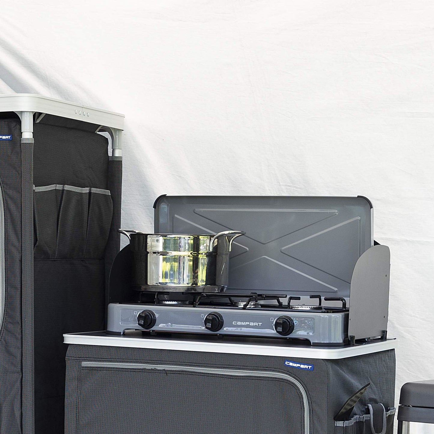The Campart Gas Stove Quebec has 3 burners with powerful 4 kW output. The stove allows for efficient and easy cooking in many settings. Additionally, it has a thermal safety system, which ensures saftey during operation. This system shuts of the gas supply automatically, if the flame blows out. The gas stove offers compatibility with an 8mm gas connector. This enables easy integration with your existing gas setup, eliminating the need for additional adapters or modifications. The straightforward connection process ensures a hassle-free experience. The 4 non slip feet ensure a sturdy and stable cooking experience which adds to convenience. Additionally, the stove features two handles which make transporting the item very easy. You can use it in your garden or bring it to your next camping trip. The detachable lid operating as a windshield has several advantages. The most obvious is of course being protection from the flame blowing out but there is also the fact that you will use fewer fuel by minimizing heat loss and maintaining a stable flame allowing for better heat control.