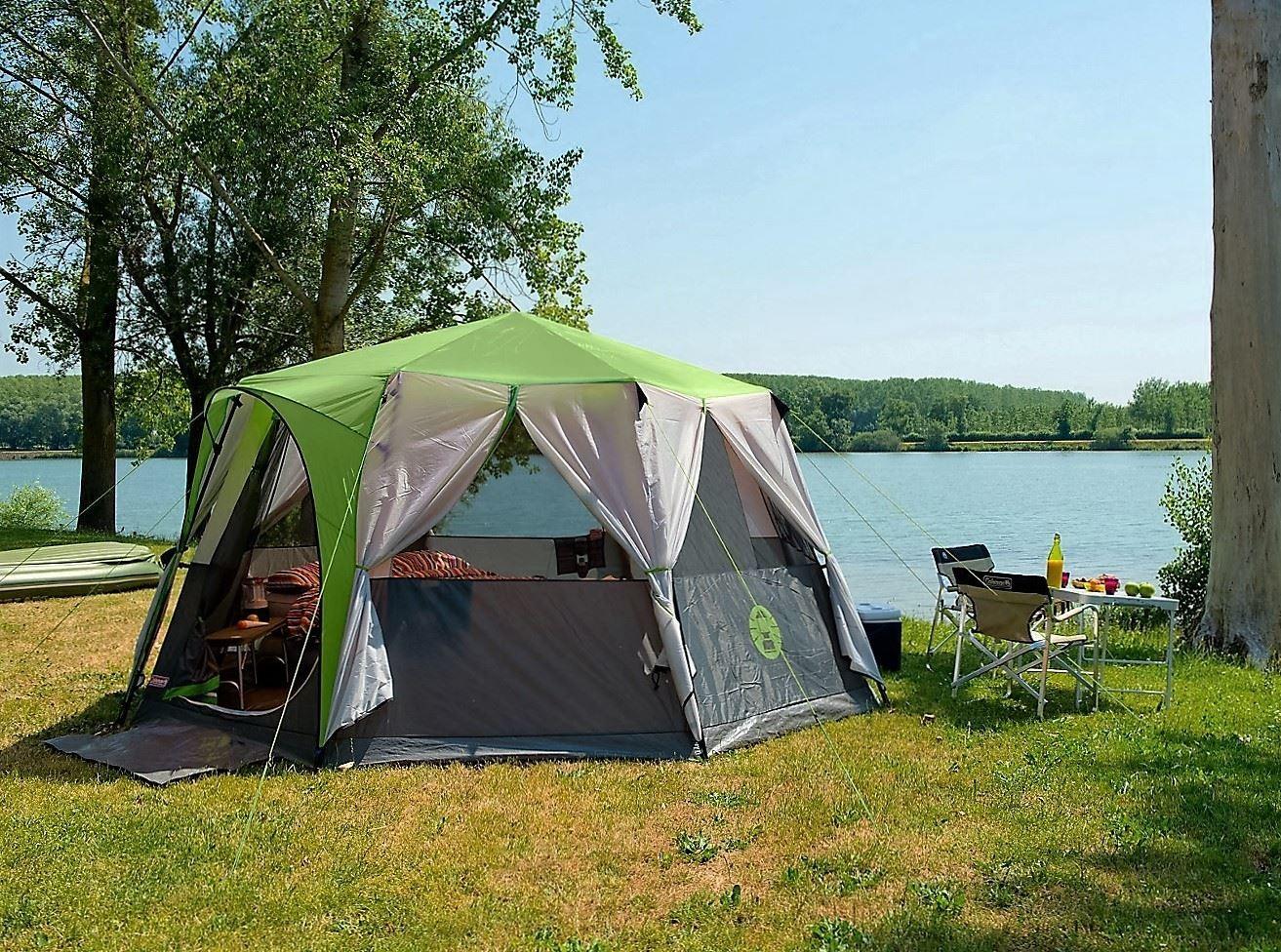 360 Degree view plus enhanced ventilation: Six large windows and mesh roof for maximum air circulation; two hinged doors open like a real door for easy access; full head height throughout the large eight person tent