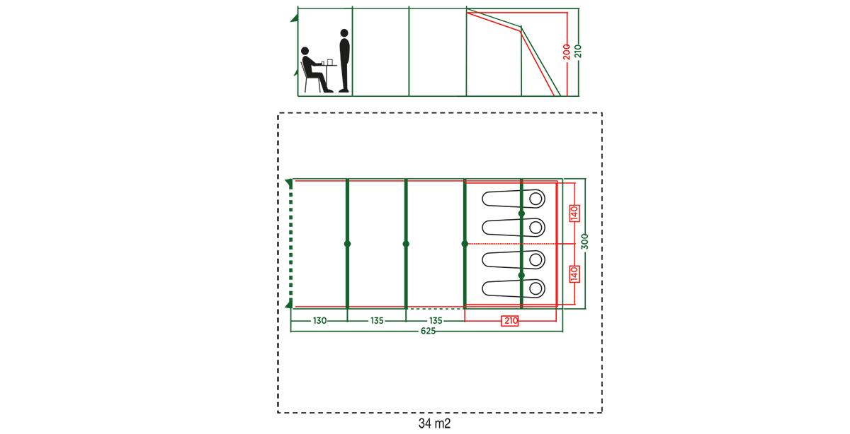 This large family tent is ideal for weekends away as well as longer breaks. The tent has an extended front porch area offering additional living space with protection from the elements. Fibreglass poles support the tent structure and ensure both a lighter weight package as well as flexibility to deflect stronger wind gusts. Both bedrooms are extra large, making them spacious enough to fit larger double airbeds. The tent benefits from good head height throughout and several large windows provide plenty of light with toggled shades for privacy. The main entrance features a drop down doorway providing barrier-free access reducing possible trip hazards. Ample ventilation is provided at the side and rear of the tent to aid temperature control and reduce condensation. Additional features include zipped cable entry points for all your powered accessories together with multiple lantern attachment points.