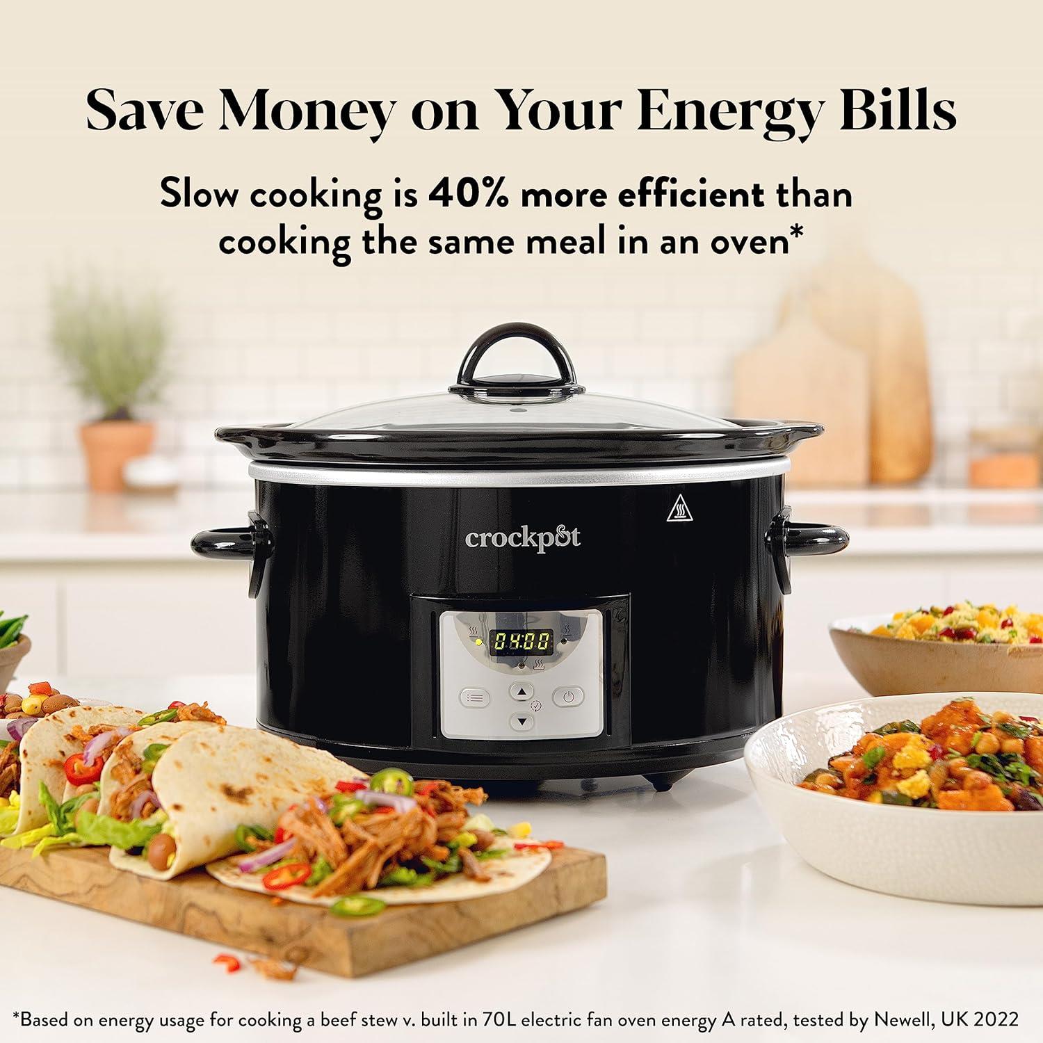 Slow Cooking Perfection: Slow, gentle heat produces delicious meals with minimal effort; ideal for soups, stews and meat joints, as well as puddings, cakes and more. Digital Controls: Choose from 3 heat settings, including Auto Keep Warm, and set a timer for between 30 minutes and 20 hours, so dinner is always ready when you are. 3.5 L Bowl: Perfect for families and smaller dinner parties; removable oven-safe bowl serves straight to the table. Easy to Clean: Lid and bowl are dishwasher-safe. Cost-Saving Cooking: Enjoy delicious, low-cost meals at home instead of eating out; slow cooking is also 40 Percent more efficient than cooking the same meal in an oven, saving you money on your energy bills.