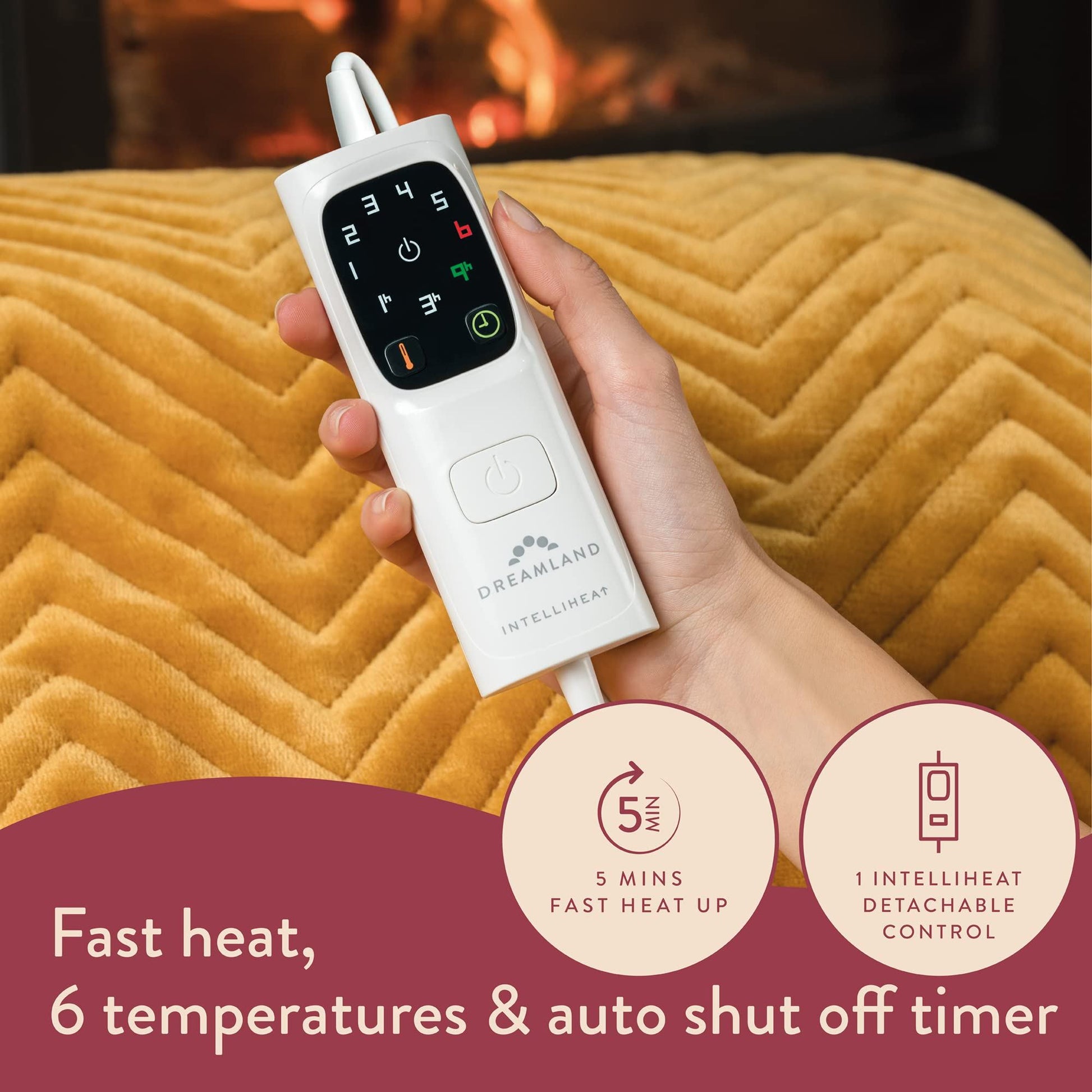 Dreamland Intelliheat+ LED Digital detachable control comes with 6 temperature settings and 1h 3h and 9h auto shut off timer, so you can just set it and forget it. The clever auto safety function automatically runs a full check of your heated throw every time you switch it on. Simply switch it on and your throw will be lovely and warm in just 5 minutes. Then, before you snuggle down to relax, select your preferred temperature, and the Intelliheat+ technology will ensure that it will maintain the same level of comfort, automatically adjusting to the temperature of your body and room, minimizing the energy consumption. The LED light brightness automatically adjusts and it has a long 3m cable.