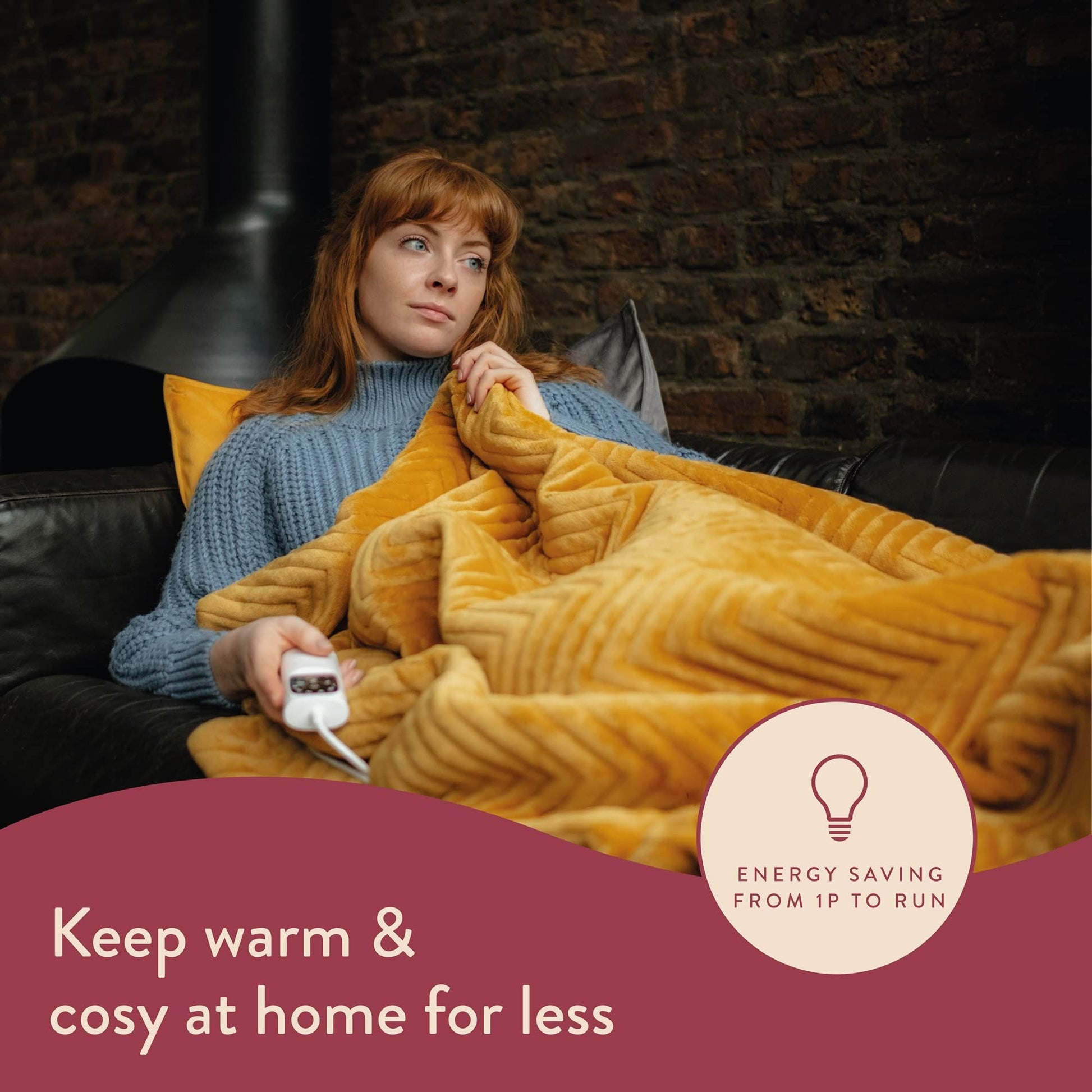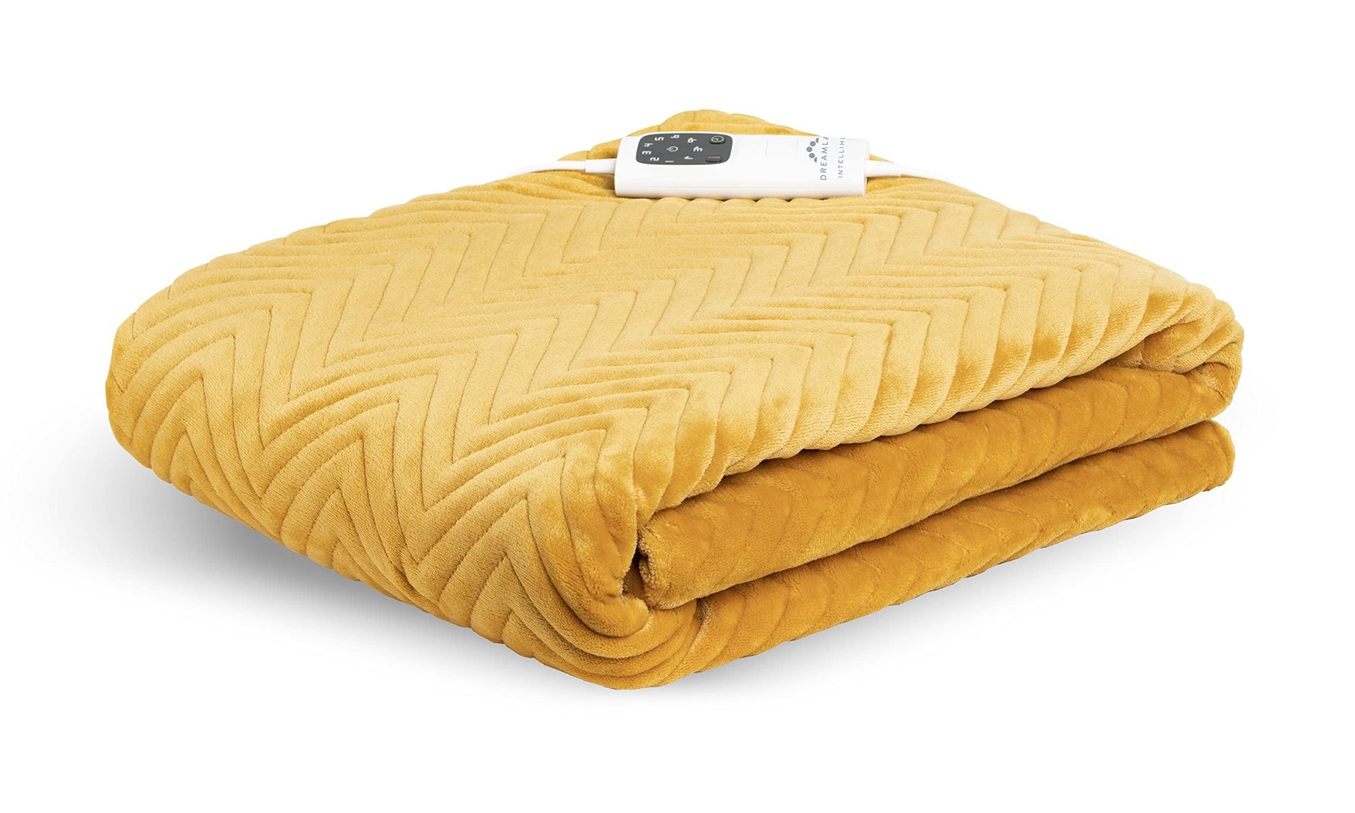 Dreamland’s Deluxe Mustard Velvet Herringbone Quilted Throw is super-soft and perfect to snuggle under, you will be warm and cosy in minutes thanks to the fast heat Intelliheat + technology. Cleverly responds to temperature changes while you sleep and relax. 5 minute fast heat up time, 6 temperature settings, 1, 3 or 9 hour auto shut off timer, detachable digital control, machine washable and tumble dry safe. Only costing from as little as 1p per night to run, so turn down your heating and turn on the blankie. Use around the home, living room, bedroom and great for outdoor living to wrap around you to take the chill away. Large one size 160 x 120 cm.
