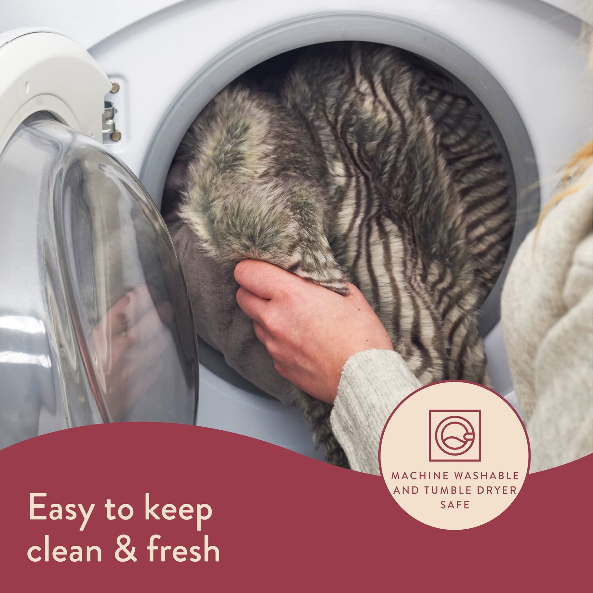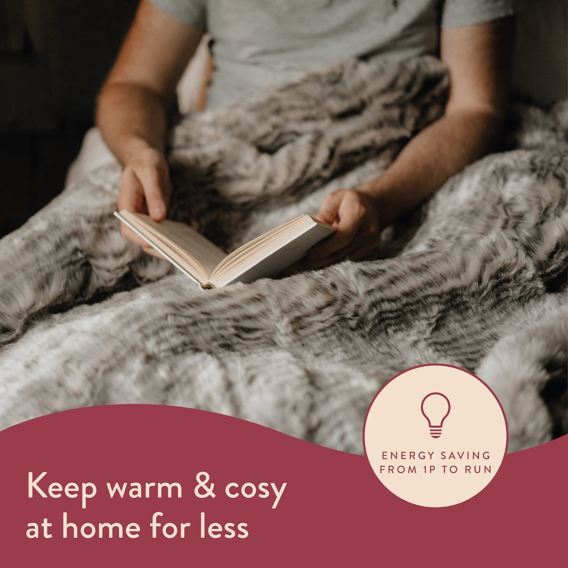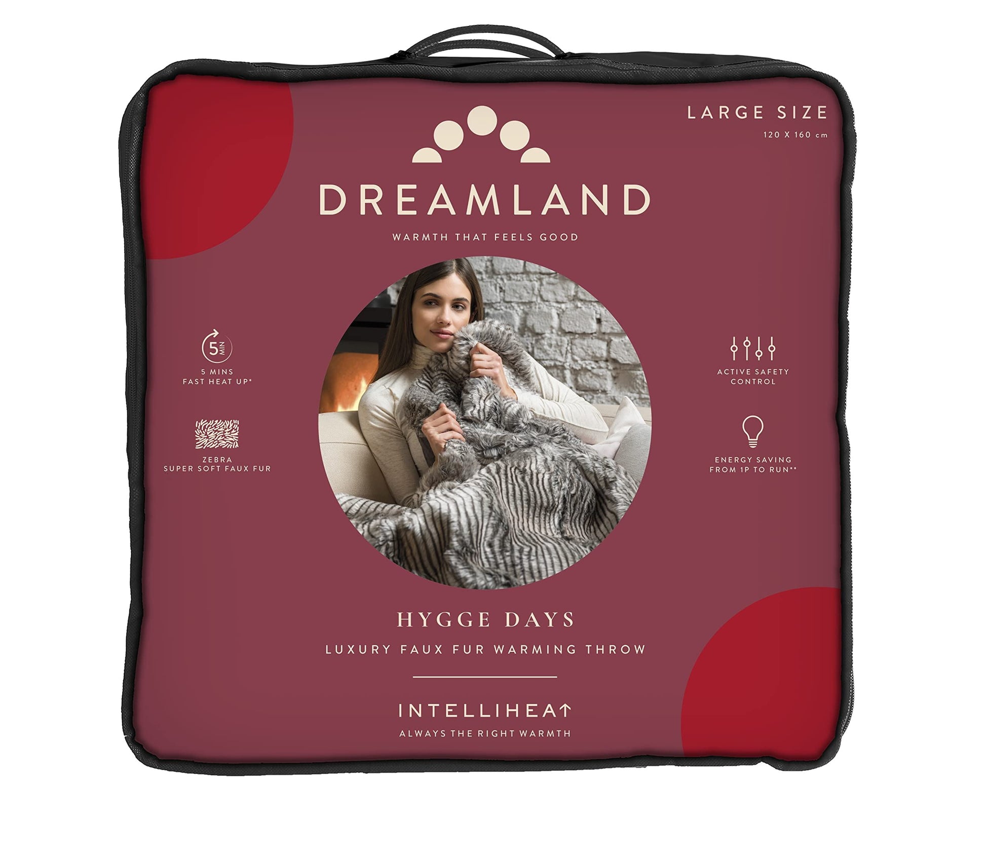 Dreamland’s fashionable deluxe Zebra Print faux fur heated throw is a gorgeous accessory to add to your living room or bedroom, and looks fabulous draped over you or your bed. It is the most luxurious way to snuggle up and watch tv. Keeping you warm and cosy on chilly nights, imagine the warmth around you from being cocooned in super soft strokeable faux fur. The reverse fabric is in a beautiful soft grey micromink fabric. Large size 160 x 120 cm. Machine washable and tumble dryer safe, to keep it clean and fresh.
