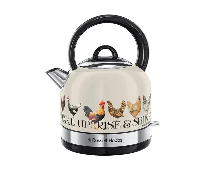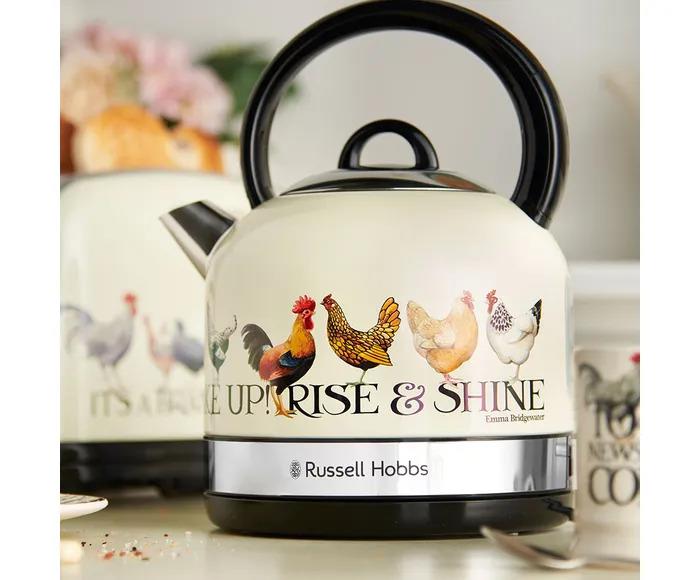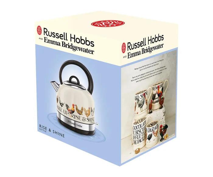 Wake up to classic British design. The 1.5L Russell Hobbs Rise and Shine Kettle, designed in collaboration with Emma Bridgewater, is packed with all the features you’d expect from Russell Hobbs. A removable and washable anti-scale filter, perfect pour spout and rear water level gauge ensures you have everything you need to create the perfect hot drink.With its premium stainless-steel cream housing and classic Emma Bridgewater design, the Russell Hobbs Rise and Shine Kettle combines iconic style with all the features you’d expect from Russell Hobbs. It’s generous 1.5L capacity is big enough to make hot drinks for all the family, while a handy water window lets you check the amount of water inside if you just want to boil enough for one cup. A perfect pour spout prevents spills and splashes for safer serving, and its removable and washable anti-scale filter helps prevent limescale passing from kettle to cup. With its distinctive design and trusted technology, the Rise and Shine Kettle promises to be a colourful and practical addition to any kitchen. With a 1.5L capacity, the kettle can make up to 6 cups at a time (depending on your hot drink size), so it’s perfect for larger households – or lots of visitors. An easy to view water window helps you to see how much water is inside your kettle, so you only boil the amount of water you need. Forget messy spills and splashes on your countertop. A perfect pour spout ensures a streamlined flow from kettle to cup. For easy and effortless filling from the tap, simply pull up the lid using the handle on the top of the kettle. A water level gauge makes measuring simple – allowing you to fill just the right amount of water you need, so you don’t waste time and energy boiling what you won’t use.