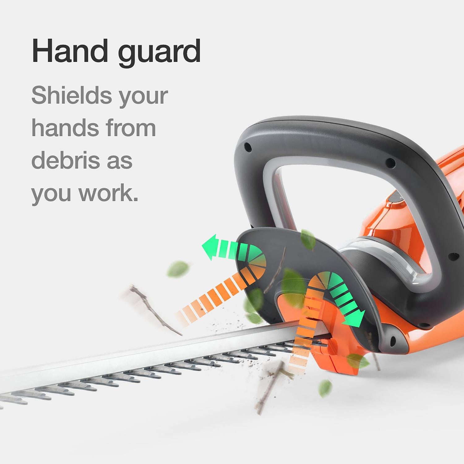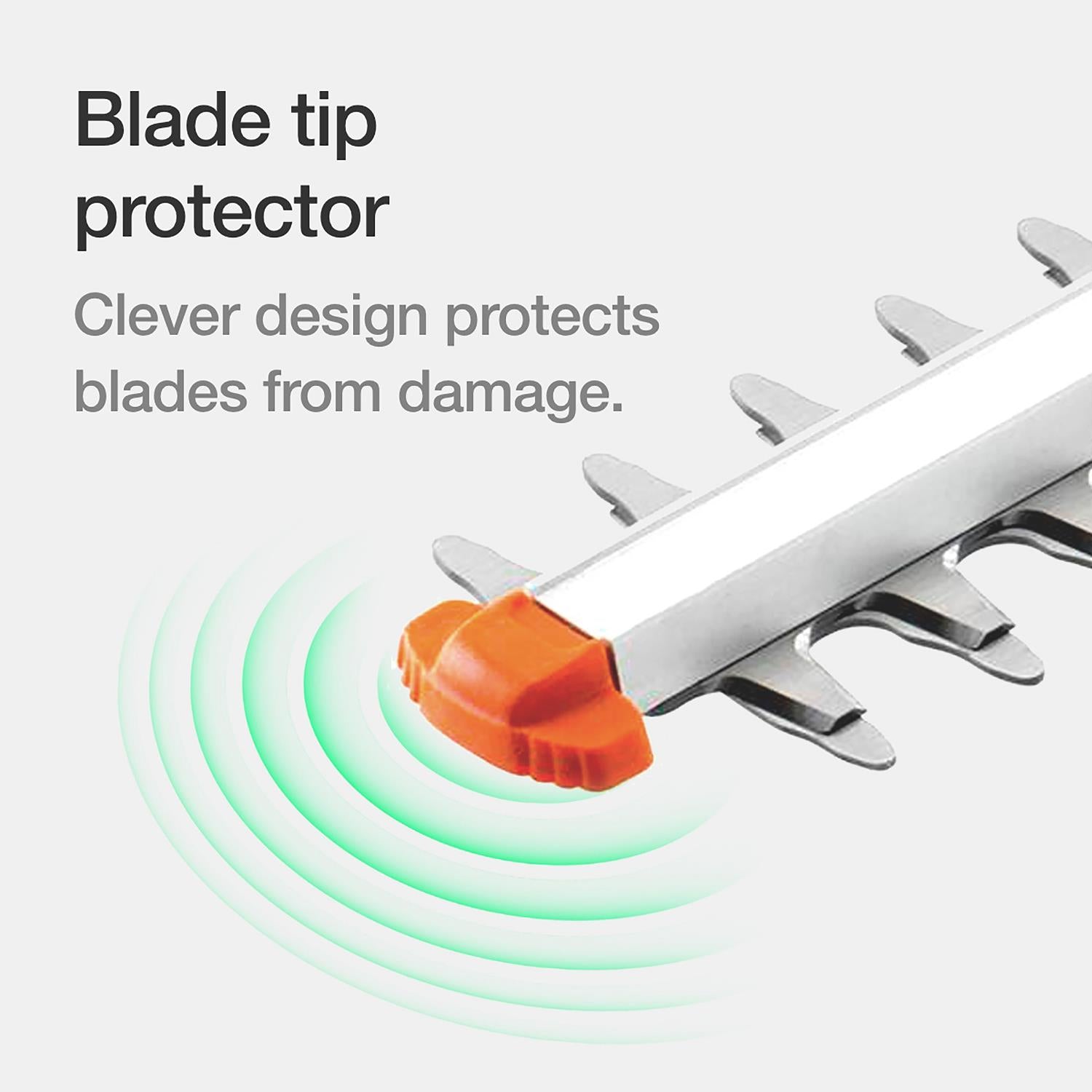 A debris guard and blade tip protector helps to increase operator safety and blade protection when trimming close to walls or fences.