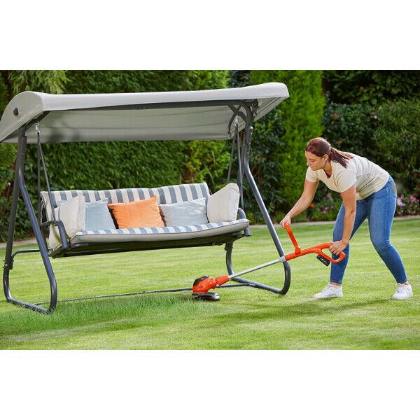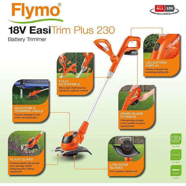 Step into a garden you’re proud to call your own with the Flymo EasiTrim Plus 230, this 23cm battery grass trimmer makes quick work in achieving the perfect finish to your lawn.Trim with speed: At the push of a button, trim under obstacles on the lawn with a 60 degree adjustable head. A quieter way to garden: Durable plastic blades that cut neatly and quietly. Built for you: Easily adjust your EasiTrim to find the most comfortable trimming position. Utilising a powerful 18V Power For All battery (included) that can trim up to 1125m² (or up to 45 minutes run time) on a single charge. Easily switch between trimming and shrubbing modes with the simple click of a button, lowering your trimmer by up to 60° to reach underneath trampolines and other garden furniture. The 23cm cutting width on the trimmer allows you to trim and edge wider areas more efficiently, saving time and effort. Enjoy durable, long lasting trimming with its convenient plastic blades – also making your trimmer lighter in weight and easier to use. The lightweight, balanced design helps to reduce fatigue while working and allows you to work more comfortably.
