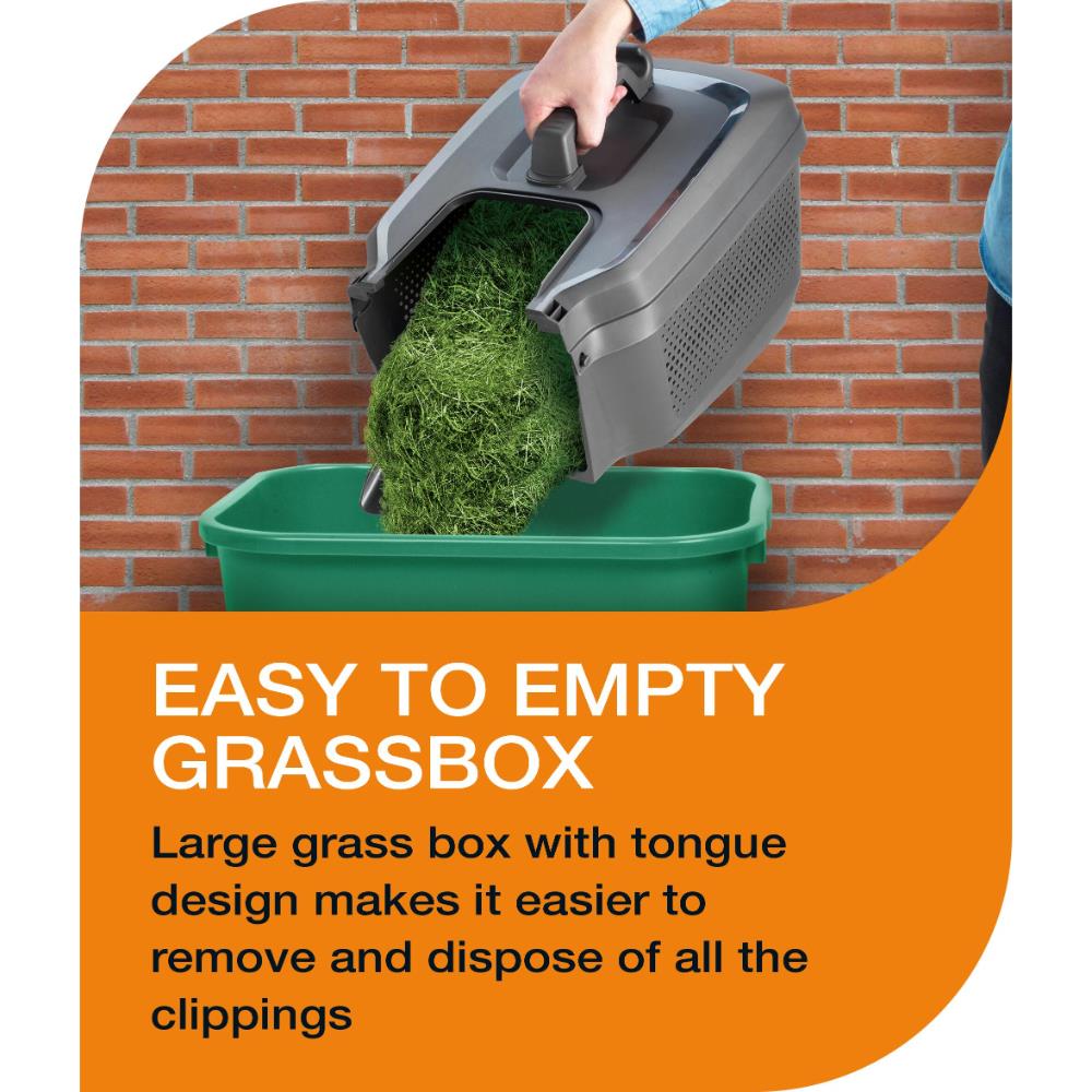 Designed for small to medium gardens, the Flymo EasiStore 300R is a corded lawnmower that comes with extra features to make mowing easy. Utilising a powerful 1200W motor and a cutting width of 30cm, the EasiStore 300R effortlessly mows whilst providing you with a perfectly striped finish to your lawn. With its close edge cutting system this lawnmower allows for a neat cut right up to the edges of your lawn or flowerbeds. Its clever vertical storage solution helps you save space and keep your shed neat and tidy. A large capacity 30L grass box collects more grass between emptying to reduce stoppage during operating, and is also designed to help prevent spilling whilst emptying. Achieve an iconic striped finish to your lawn with the equipped rear roller. With dual lever handles you can operate the mower with either hand so you can manoeuvre around corners and hard to each places with ease.