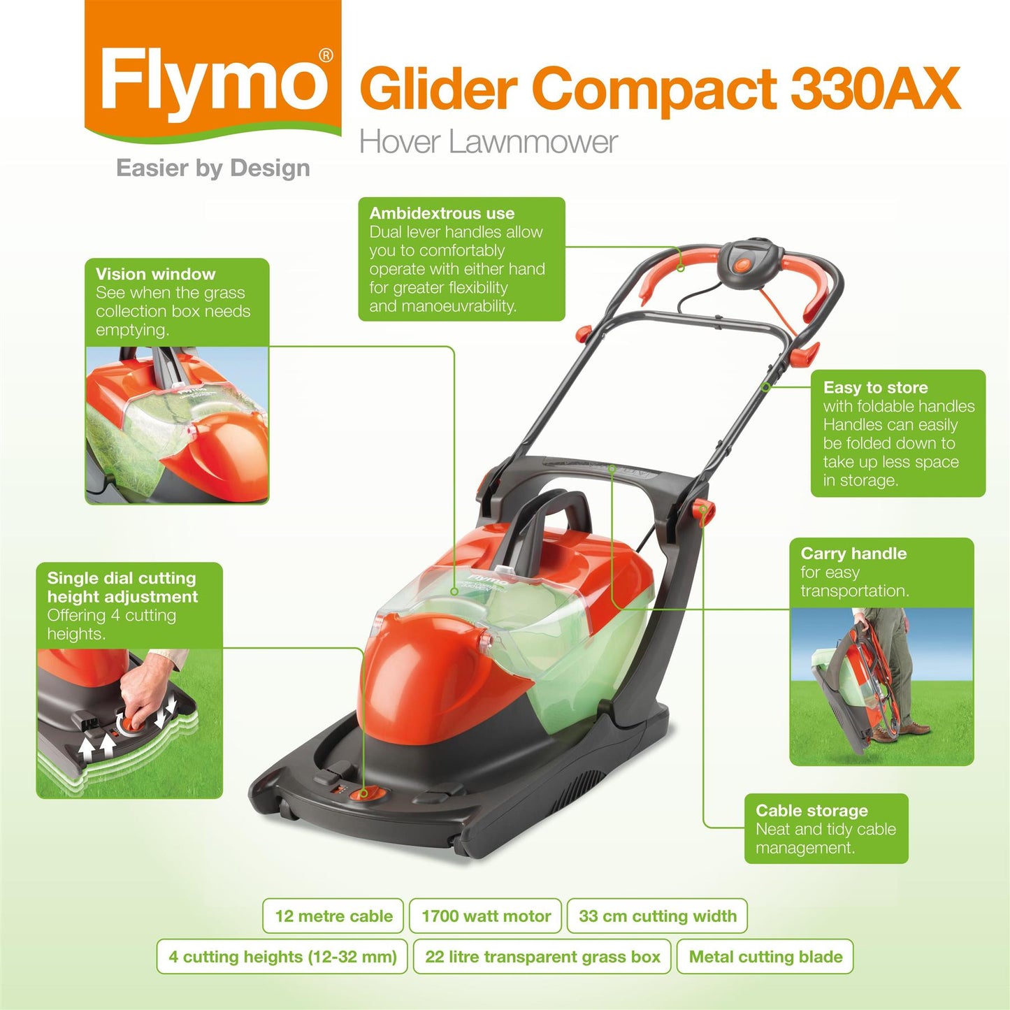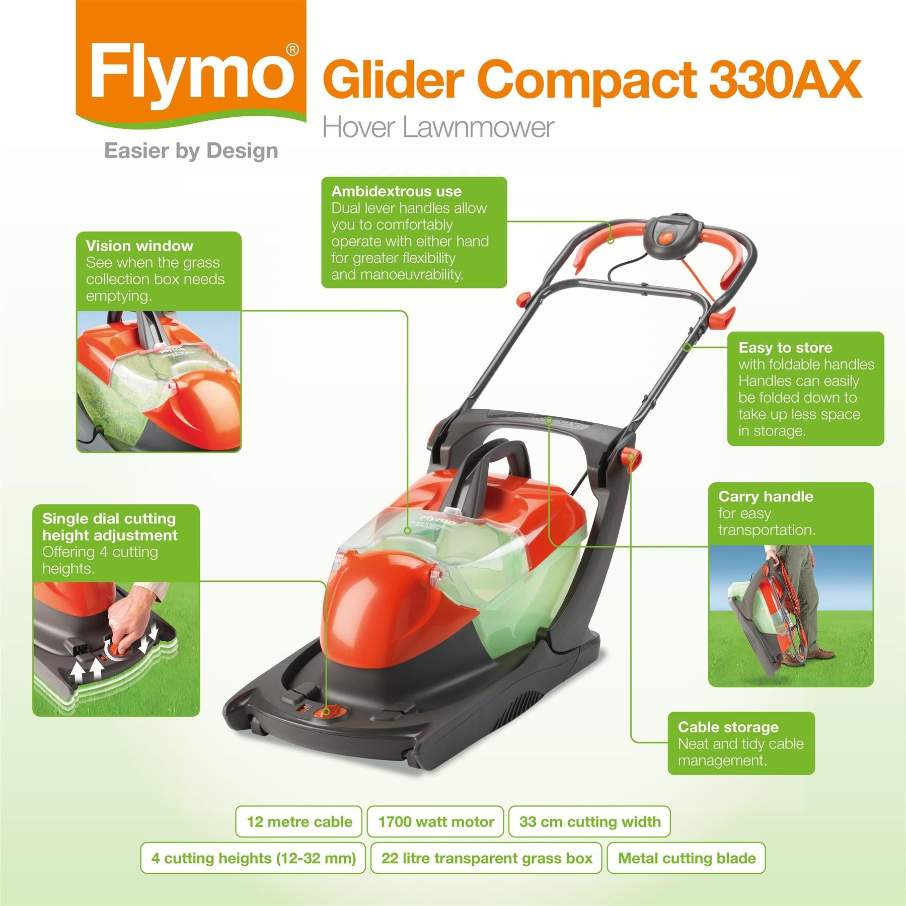 Designed for medium sized gardens, the powerful 1700W electric hover mower with a cutting width of 33cm glides across the lawn cutting, collecting and then compacting the grass in its large 22L grassbox. It's compact design allows it to cut close to walls and fences, while it's handles neatly fold over the machine for neat and tidy storage. Hovering on a cushion of air, this compact mower glides over gentle slopes and bumpy gardens with ease. Utilises a powerful 1700 W motor and 10 m cable that is ideally designed for small to medium gardens so you can mow the length of your lawn without an extension cable. A 33 cm cutting width and 12-32 mm cutting height that utilises a central height adjust ensures a neat and tidy finish to your lawn. Equipped with an 22 Litre Easy Lift grass box that collects and compacts grass trimmings as well as comes with a vision window, allowing you to see when it needs emptying. Folds away for neat and tidy storage.