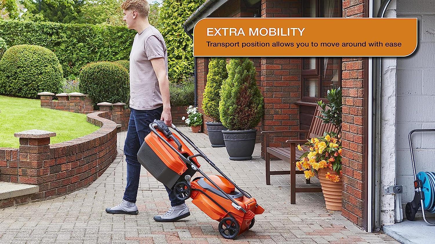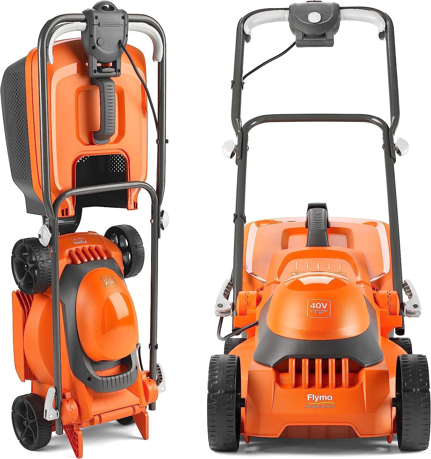 Designed for small to medium size gardens and powered by two 20V Li-Ion batteries to give 40V performance. The Flymo SimpliStore 300 Li is a 30cm battery wheeled lawnmower with essential features to make mowing simple with no restricting power cord for greater freedom & flexibility.Designed for ambidextrous use, the SimpliStore 300 Li is equipped with dual lever handles. Allowing you to comfortably operate with either hand for greater flexibility and manoeuvrability. Lightweight, this mower also features a convenient handle on top of the mower which makes it easier to carry to and from the lawn. The SimpliStore 300 Li's handles also easily fold down so the mower can be stored away neatly and can also be stored vertically for saving much needed floor space. Easy to empty, the grass box features a tongue design to make it easier to remove and dispose of all your grass clippings. Utilises a powerful 40V (20V x 2) battery so you can tackle your lawn with ease. A 30 cm cutting width and 25-65 mm cutting height with 3 level ensures a neat and tidy finish to your lawn. Equipped with a large 30 Litre grassbox meaning less time spent emptying grass clippings. Cover the whole lawn without the restriction of a power cord for greater freedom and flexibility. Equipped with dual lever handles allow you to comfortably operate the lawn mower with either hand for greater flexibility and manoeuvrability.
