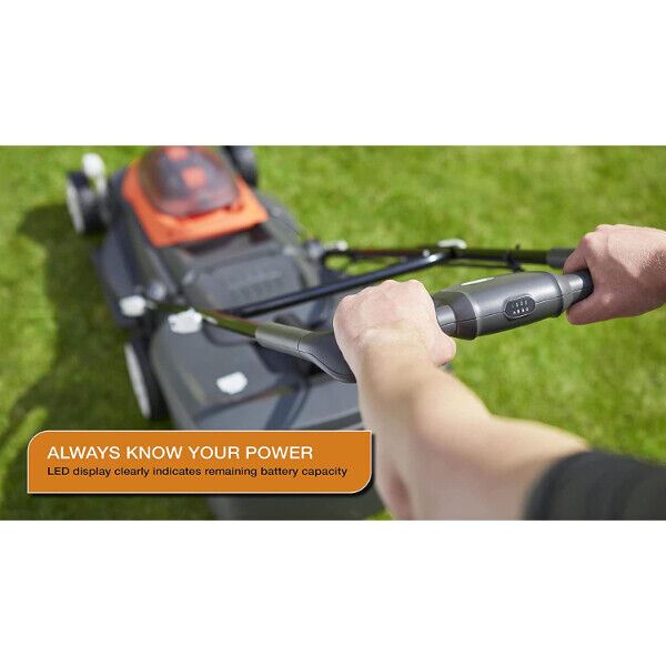 Designed for medium to large sized gardens, the 36V UltraStore 380R cordless lawnmower uses 2 x P4A 18V batteries for a powerful cutting performance - making mowing easy with no restricting power cord for greater freedom & flexibility. Utilising two 18V 25 Power For All batteries (included) for a powerful 36V performance that can mow up to 230m² of your lawn on a single charge. Its 38cm cutting width and a 20-60 mm cutting height with 5 steps ensures a neat and tidy finish. A close edge cutting system with grass combs allows a neat cut right up to edges of the lawn or flowerbeds, reducing the need for trimming afterwards. The large 45 Litre grassbox takes longer to fill so you can spend less time emptying grass clippings. The clever vertical storage position means it takes up less floor space keeping your shed neat and tidy, or you can simply fold the handles down flat to store away neatly. Equipped with all the features that come with the EasiStore, this lawnmower also includes an ergonomically shaped palm rest for maximum comfort when in use. The 18V Power For All battery can be shared across a wide range of tools within the Power For All Alliance.