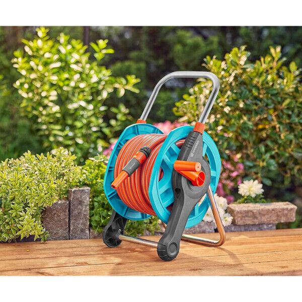 The GARDENA Basic Wall Hose Reel Set 25m is the perfect solution for flexible watering. You can either use your hose as a practical hose trolley, or use the handy wall bracket and mount to a wall for convenient, practical irrigation and storage. With a large crank handle, and swivel axle that prevents the hose from turning, the Hose Reel Set makes watering your garden easy. Sold as a ready-to-use set, it includes a tap connector and adapter, 3 hose connectors, one water stop, 25m hose, spray nozzle and wall bracket. The hose reel is made in Europe and with a 5 year warranty.