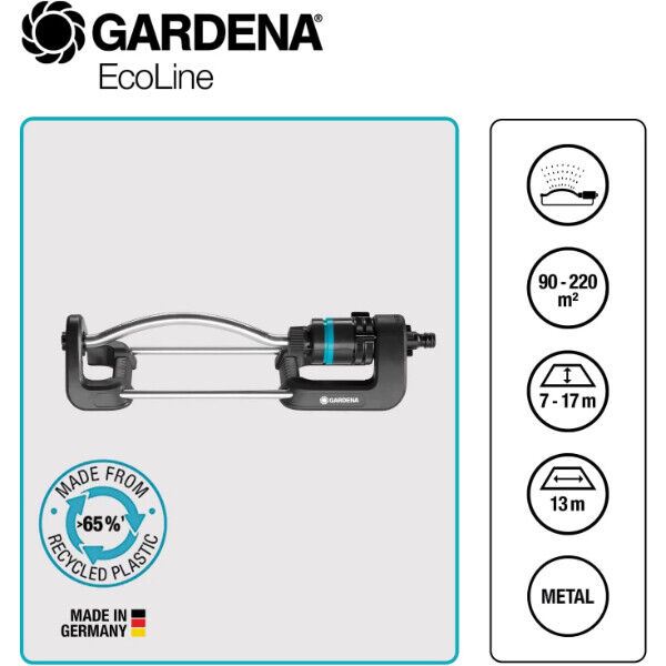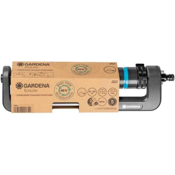 The GARDENA EcoLine oscillating Sprinkler, with a fully adjustable spray range can irrigate gardens from 90 to 220m. The Sprinkler is made from over 65% recycled post-consumer plastic, making it the natural choice for passionate gardeners. The sprinkler is easy to set up and adjust to the size of your garden up to 220sqm. The sprinkler is also easy to keep clean and maintain thanks to the integrated cleaning needle, allowing you to clear nozzles of any blockages or limescale build up. Compatible with other leading brands the sprinkler is frost proof, made in Germany and comes with a 5 year warranty. The EcoLine Oscillating Sprinkler is ideal for evenly watering rectangular lawns or beds between 90 and 220 m. Set your spray width, range (7 to17 metres) and area with the easy to adjust slider - reaching a maximum of 13 meters in width. The plastic used is made from more than 65 percent recycled material from household waste. In addition, the aluminium pipes are made of more than 25 percent recycled material.