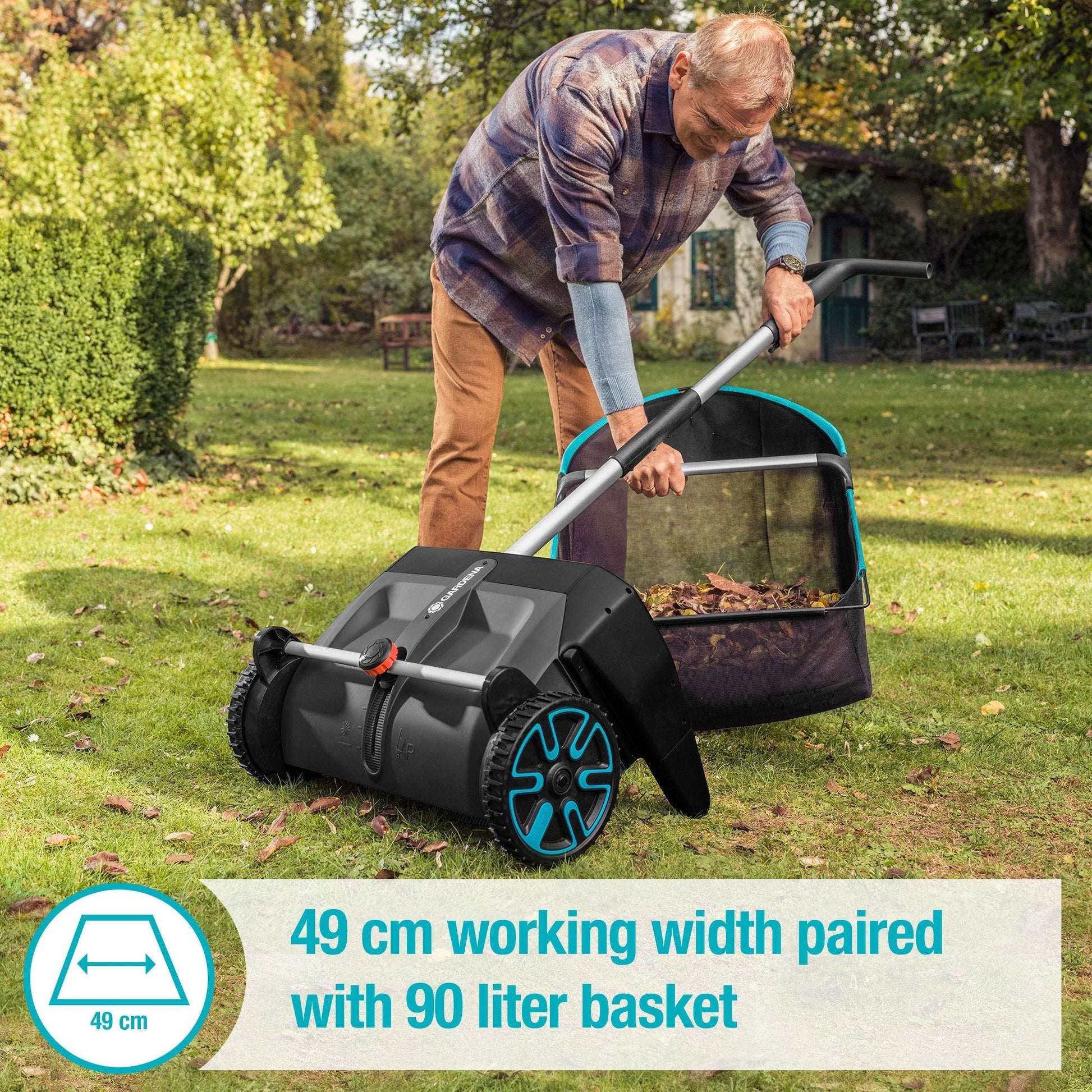Instructions for use: The GARDENA leaf and grass collector works like a mechanical rake and is therefore environmentally friendly. The rotating brushes are driven by the wheels. Solid objects such as acorns, chestnuts, fruit etc. are not collected. The leaf and grass collector is only partially suitable for foliage with stems and large leaves (e.g. chestnut) as these may get caught in the brushes. When collecting leaves on paved paths or tarmac, it may be necessary to go over the area multiple times.