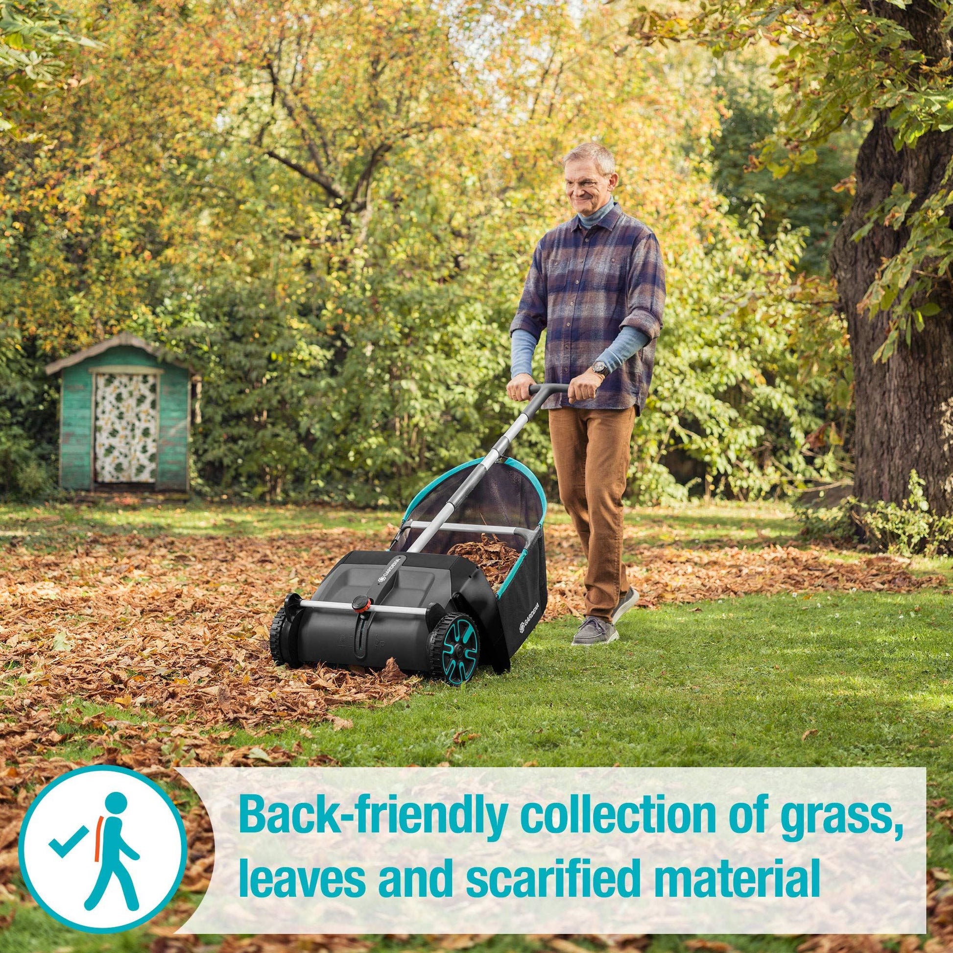 Sustainable and Quiet: The GARDENA Leaf and grass collector is a quiet, environmentally friendly way to collect fallen leaves, garden debris and cut grass. With the specially designed bristles, simply push the collector along the ground and watch it collect.