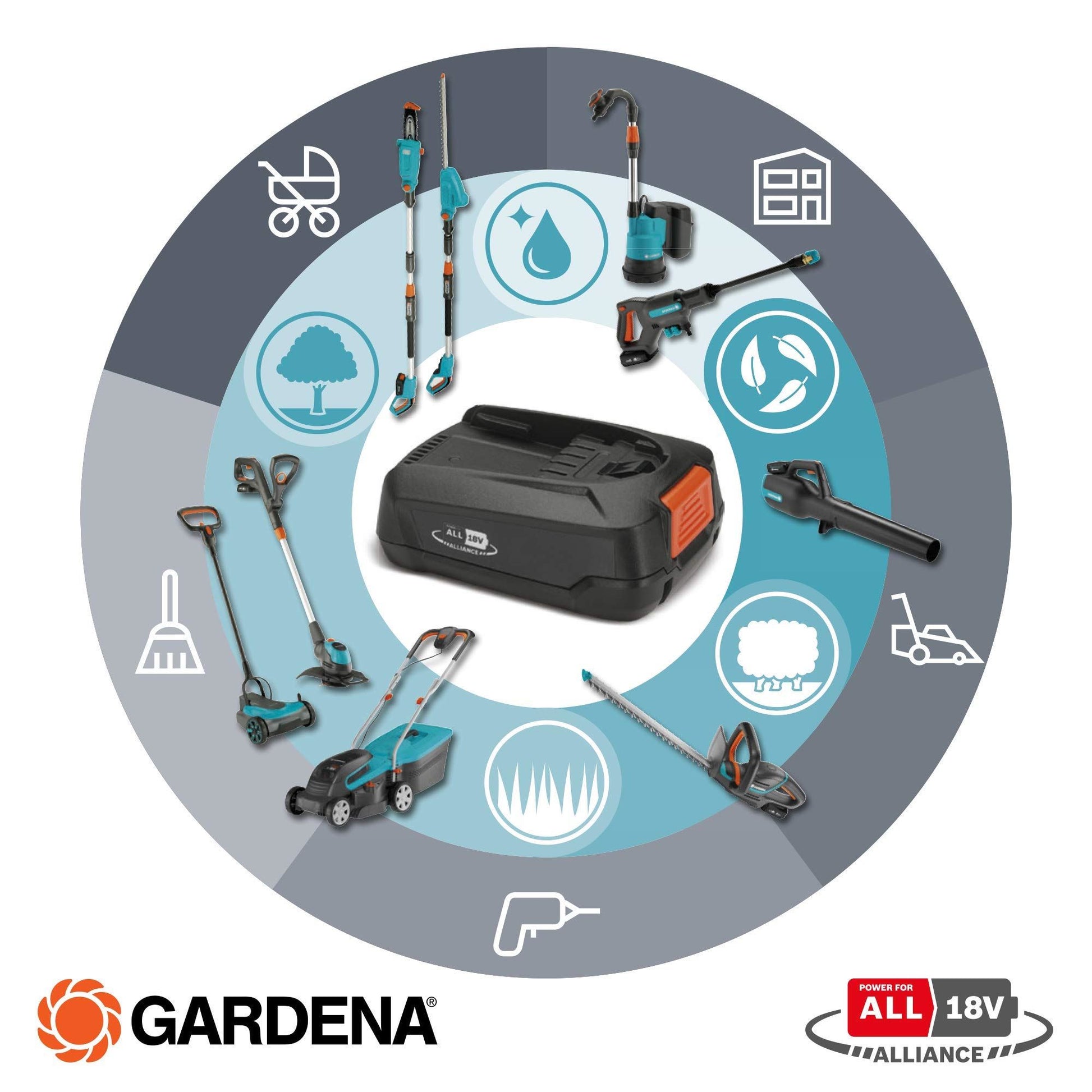 To realize your perfect garden with GARDENA battery garden tools, the 18V GARDENA POWER FOR ALL System battery PBA 18V/72 gives you the power you need. It brings you strong and long-lasting power for all jobs that need to be done in the garden. The Lithium-Ion cells inside the battery pack can be charged quickly and every time, without memory effect for a long battery life time. With its capacity of 4.0Ah it is compatible with all GARDENA 18V POWER FOR ALL- tools. It fits perfect, if you need extra-long runtime for large jobs in your garden, can be used in handheld tools and lawn mowers. Furthermore the battery is compatible with numerous other tools from participating brands of the POWER FOR ALL ALLIANCE around your home and garden. This means that you no longer need to buy one battery for every product. You save money and stay flexible at all times! Passion powered by GARDENA – Battery garden equipment that gives you the freedom to create.