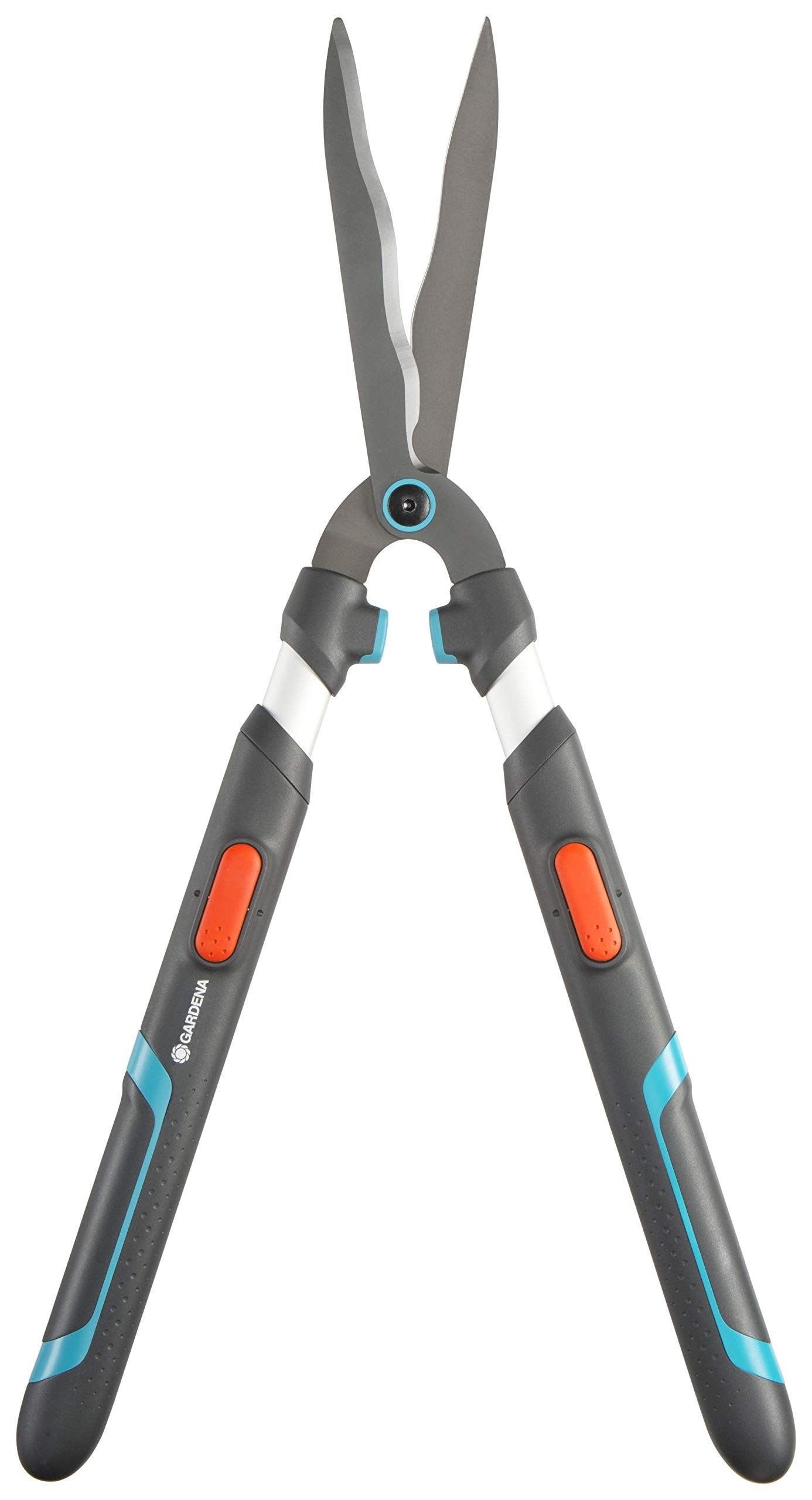 GARDENA's Hedge Clippers TeleCut, with clever telescopic function, become your extended arm for cutting hedges and shrubs. The TeleCut lets you increase your reach from 70 to up to 90 centimetres thanks to the extendable telescopic arms. This saves you unnecessary stretching and there's no need to climb a ladder because you can simply cut higher hedges from the ground. The cutting power is also increased thanks to the well-balanced handles. The hedge cutter's aluminium arms are lightweight and easy to use, saving you a lot of effort. The ergonomic, fibreglass-reinforced plastic handles bring added comfort, as they are robust, durable and provide an excellent grip. When cutting, you will notice the practical soft buffer, which absorbs shock to your wrists when cutting tough foliage. The durable steel blades are innovatively designed with a waved grinding. This waved grinding delivers top results when cutting larger areas especially because leaves and branches are held in the cutting area and do not slip away when cutting. The cutting experience is rounded off with the non-stick blade coating, which reduces friction and ensures smooth working. The blades have an integrated branch cutter, which efficiently cuts individual thick branches. Underlining that the Hedge Clippers TeleCut are a true quality product, GARDENA gives you a 25-year manufacturer's warranty on the product. Closer to your vision with every cut. Easy to handle, effective and durable: Cutting tools for creative gardeners.
