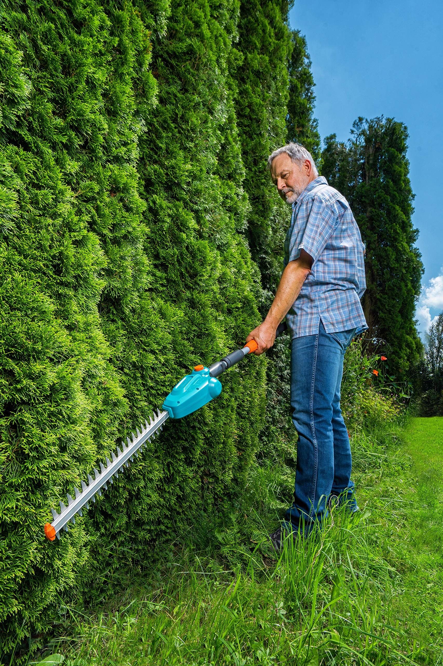 Need to reach further? Not a problem for the GARDENA Telescopic Hedge Trimmer, allowing you to cut hedges up to 3m high safely from the ground. The tiltable trimmer head also allows you to get that neat finish at the top or bottom of the hedge. Powered by the powerful POWER FOR ALL ALLIANCE 18V battery (not included) you can get a run time of up to 100 minutes on a single charge. The robust, precision ground 42cm blade ensures a clean, healthy cut every time. The LED battery indicator on the hedge trimmer will show you how much battery power you have left. Cordless Convenience: Thanks to the 42cm blade length, you'll quickly get your hedges into shape across their entire width. Branches and twigs of up to 16mm in thickness will fall without effort. Safe and Secure Trimming: This lightweight hedge trimmer can cut to heights of up to 3m high - with the ergonomically design handle fitting comfortable in your hand at the ideal centre of gravity, so you can cut high hedges with little effort and a secure footing. Durable and Robust: The blade geometry is perfectly designed for a precise, clean, fast cut - you'll hardly need to use any force at all.