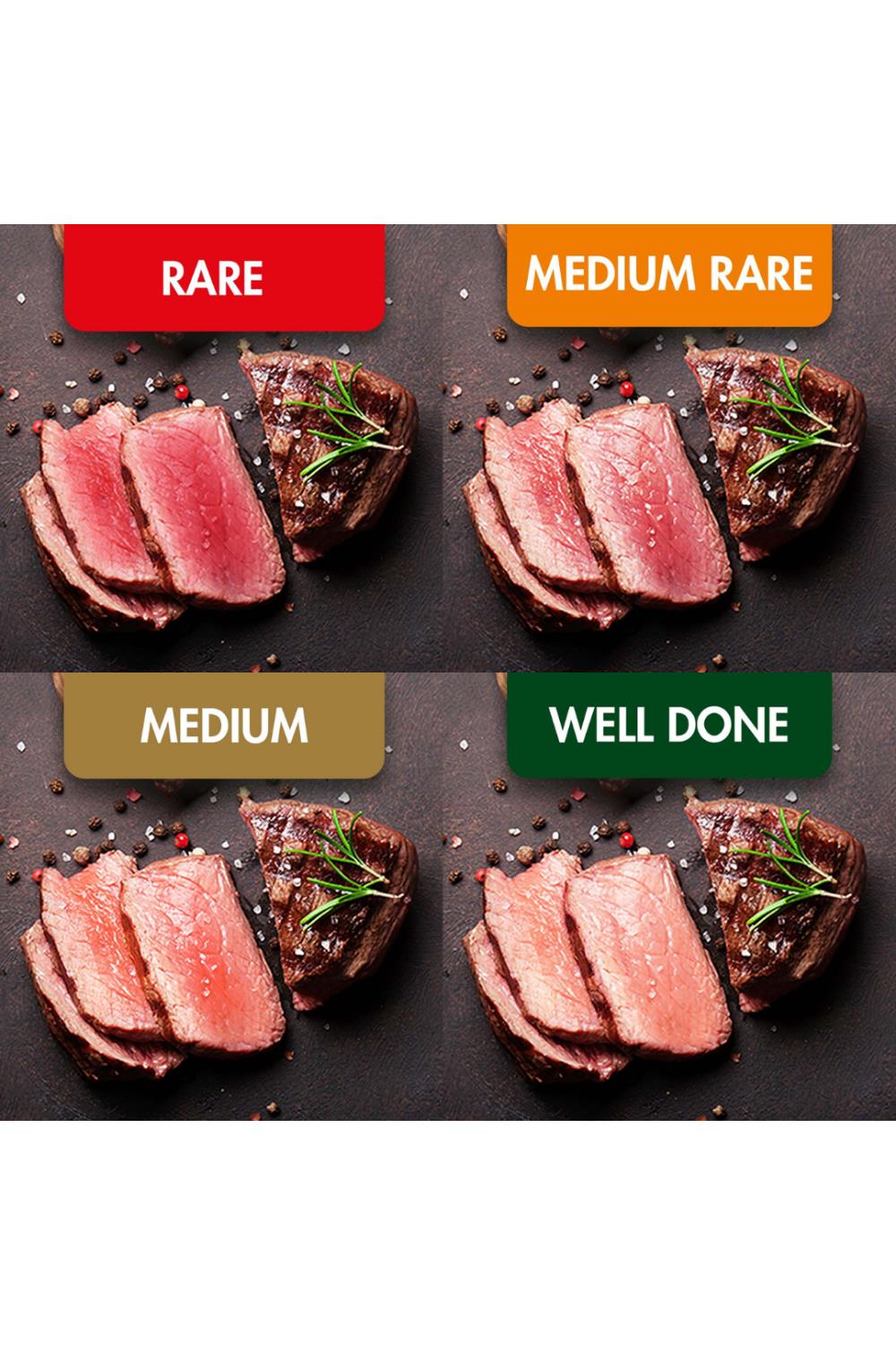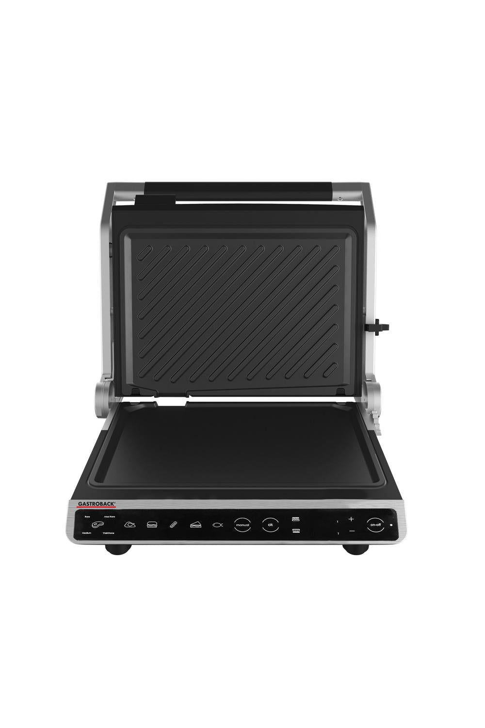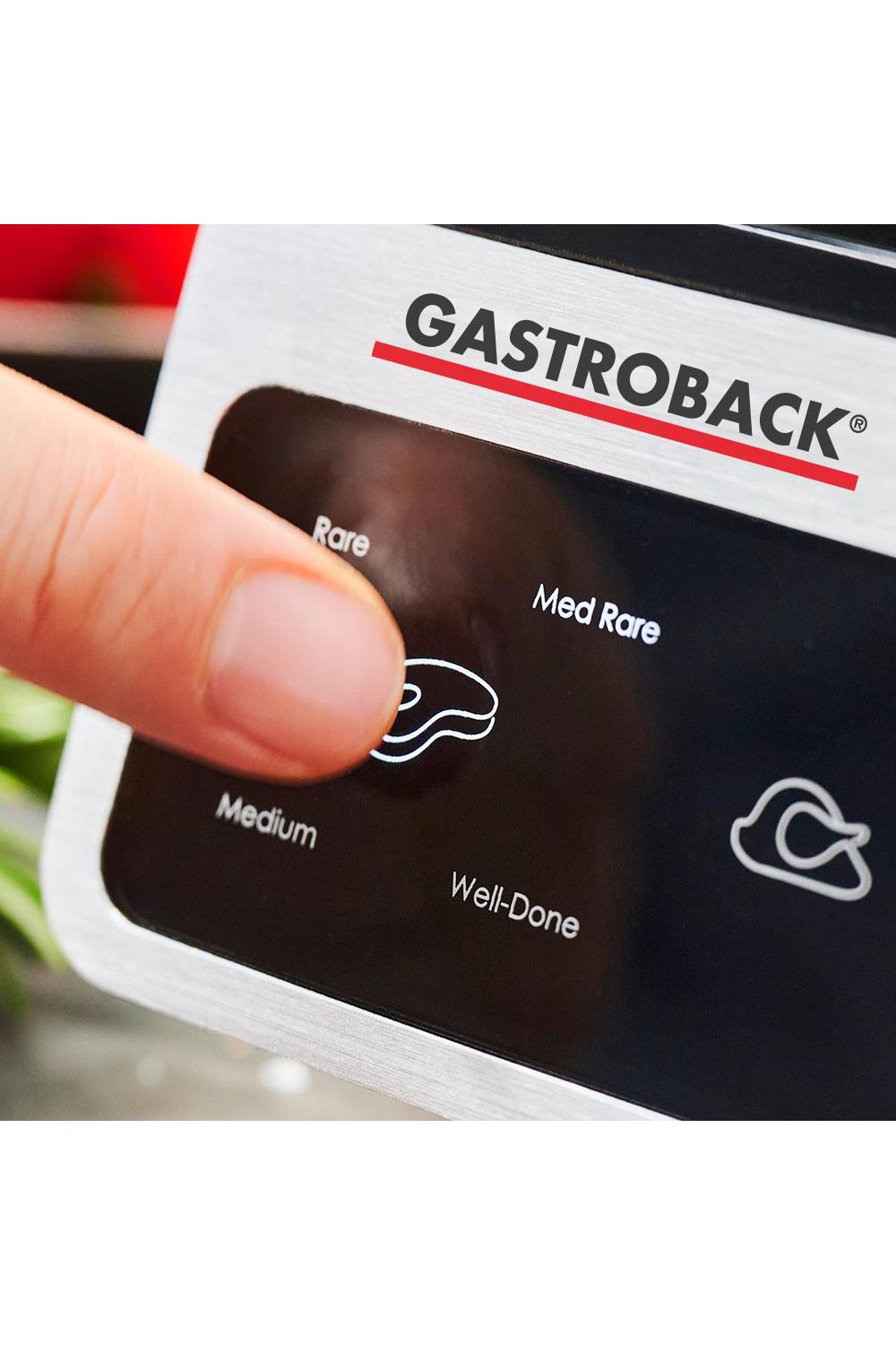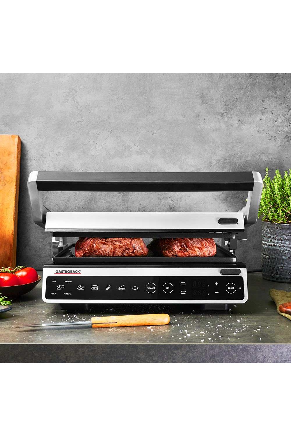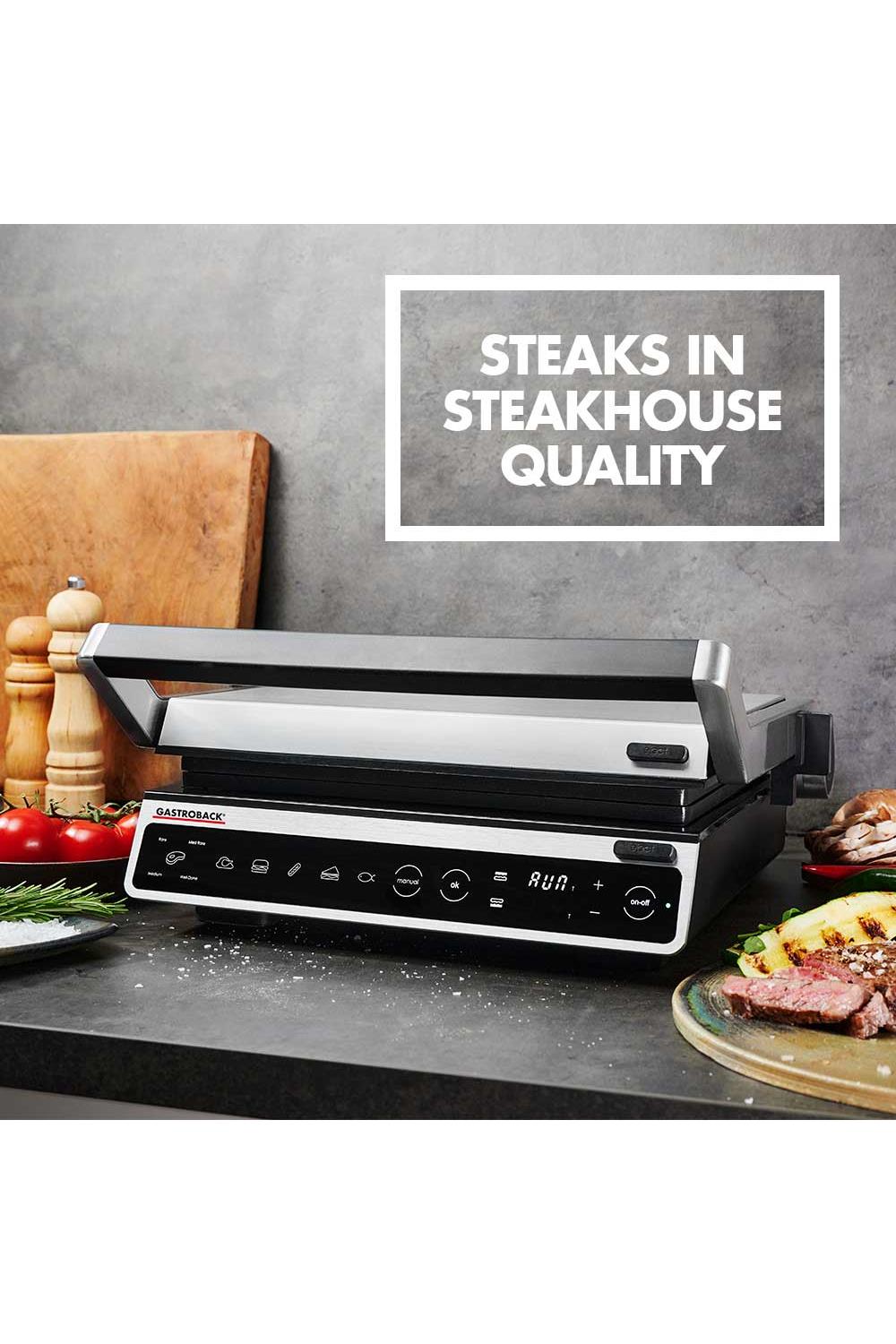 The feature-packed Gastroback Design BBQ Advanced Smart automatically adjusts the grilling time to the thickness of meat being cooked for perfect results every time (the upper grill plate is height adjustable to accommodate different thicknesses of meat). There are 6 grill programs with preset temperatures for steak, poultry, burgers, sausages, sandwiches, fish and a manual mode. The steak program has 4 cooking levels for rare, medium rare, medium and well done.