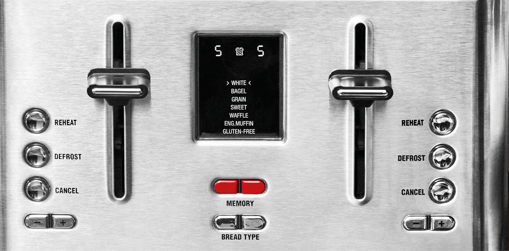 7 toast programmes with preset toasting times for wholemeal bread, white bread, bagels, sweet bread, toast waffles, English muffins or gluten-free bread.