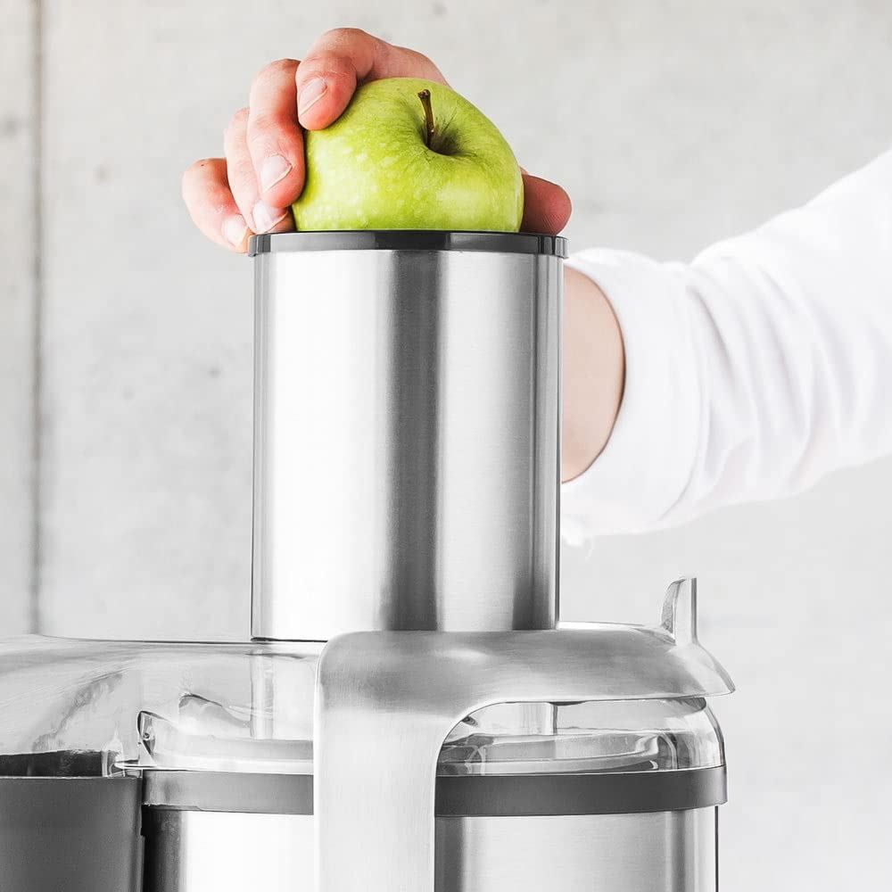 The 1,300 watt professional motor is electronically controlled and can also handle, with ease, hard vegetables or spice roots such as ginger. The XXL filling chute with a diameter of 84 mm also swallows unshredded fruits, eliminating the need for time-consuming pre-cutting. The juice outlet with splash protection and drip stop prevents dripping and thus ensures a clean work surface. The subsequent cleaning is also quick and easy, as all relevant parts are dishwasher-safe.