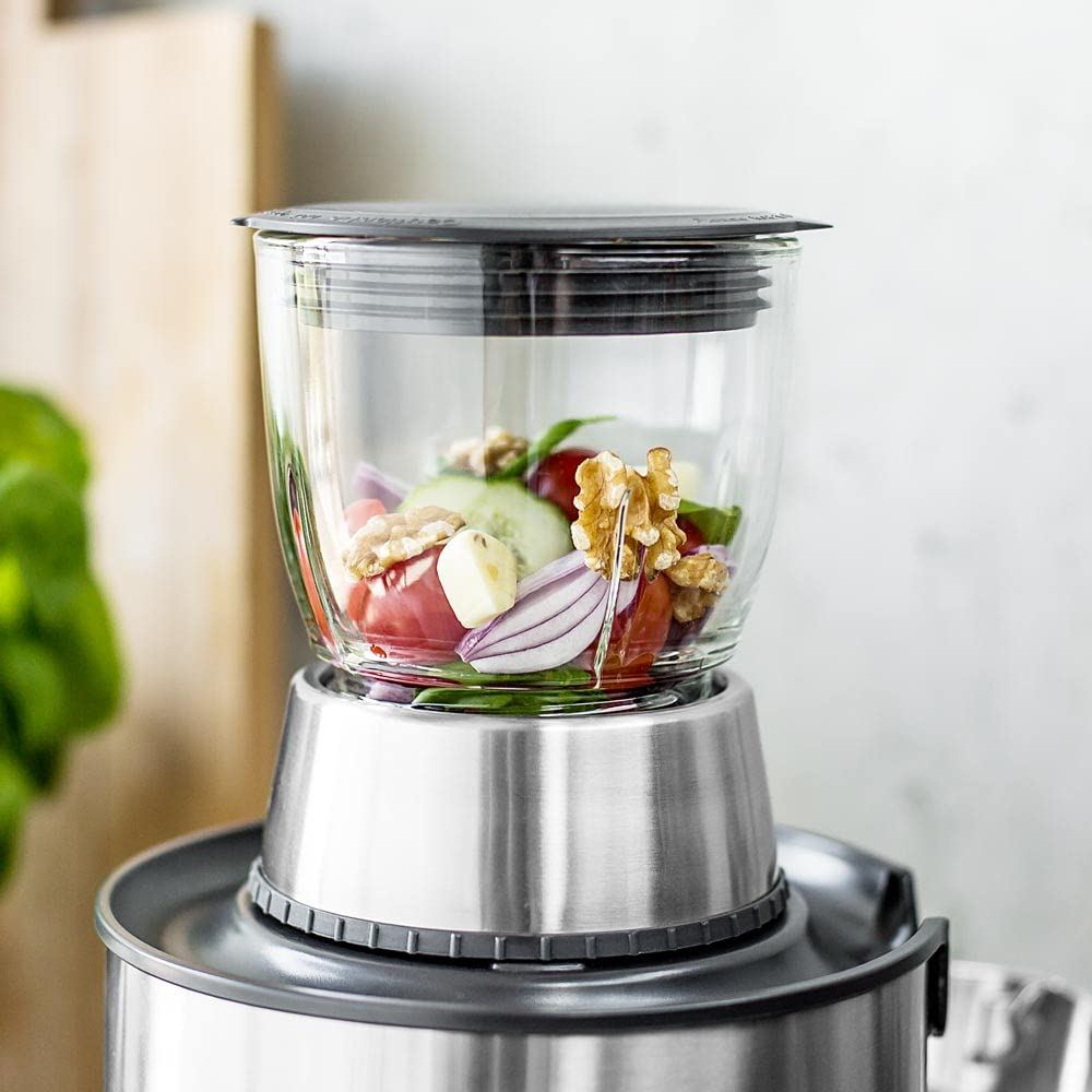 4 in 1 - Juicer, stand mixer, food processor and coffee grinder. Stainless steel design, 5 speed settings, 1300 watt professional motor / electronically controlled / very quiet. Quick and easy to clean (all accessories are dishwasher-safe). Non-slip feet.
