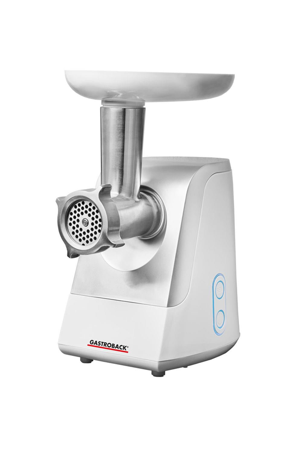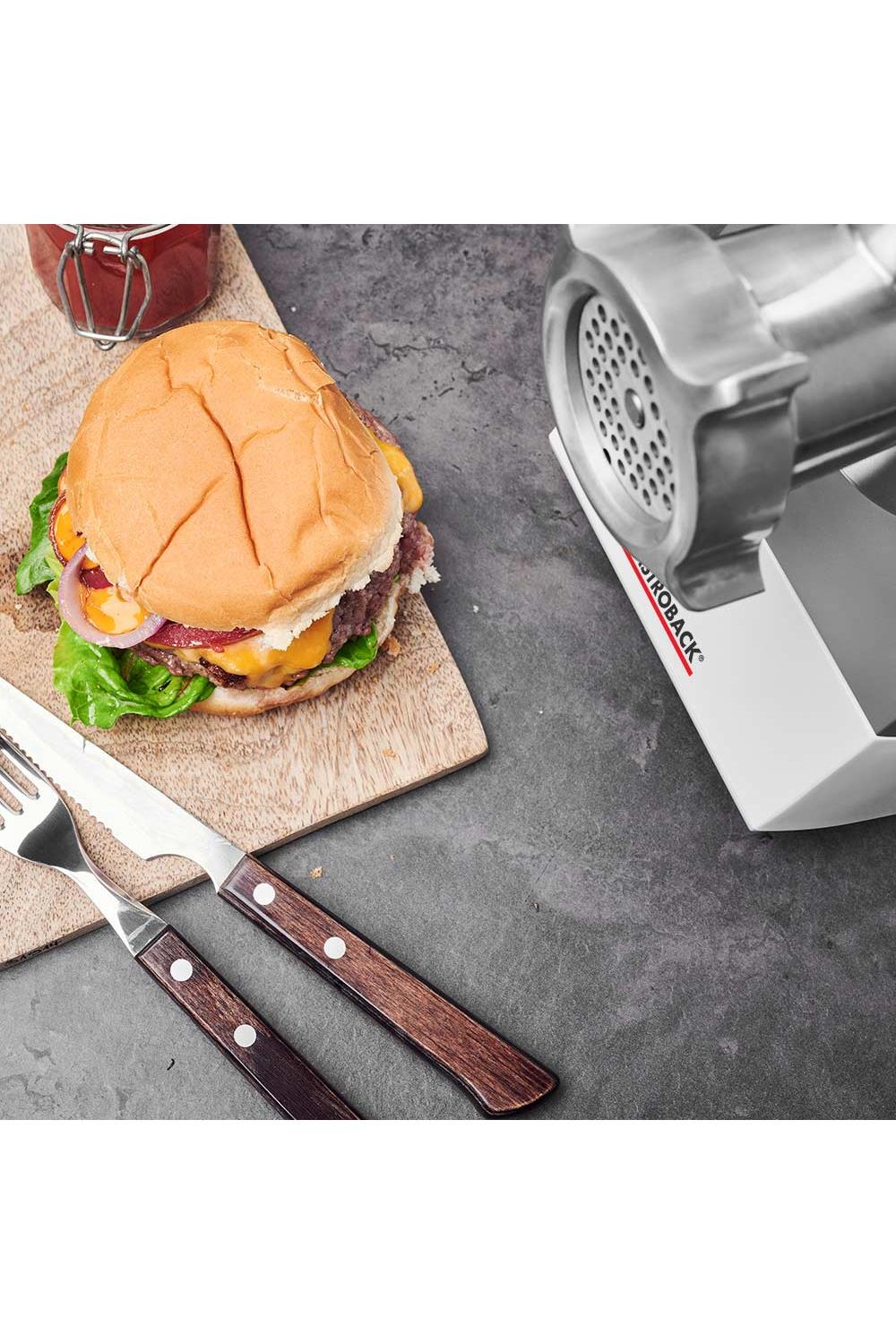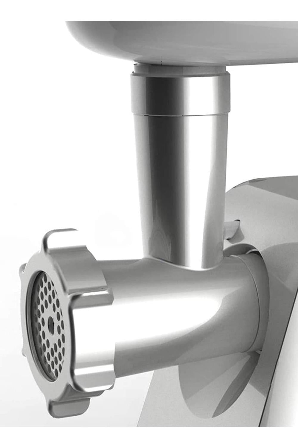 Electronically regulated motor (1500 watt max.). Worm housing made of cast metal. Stainless steel cross-blade knife with 4 blades. LED-illuminated control panel. On/off button and reverse. Grinding disc aperture: 50mm. Including 2 grinding discs for chunky meat, sausage filing attachment, pusher, food tray, cookie attachment, kebbe attachment for oriental cuisine.