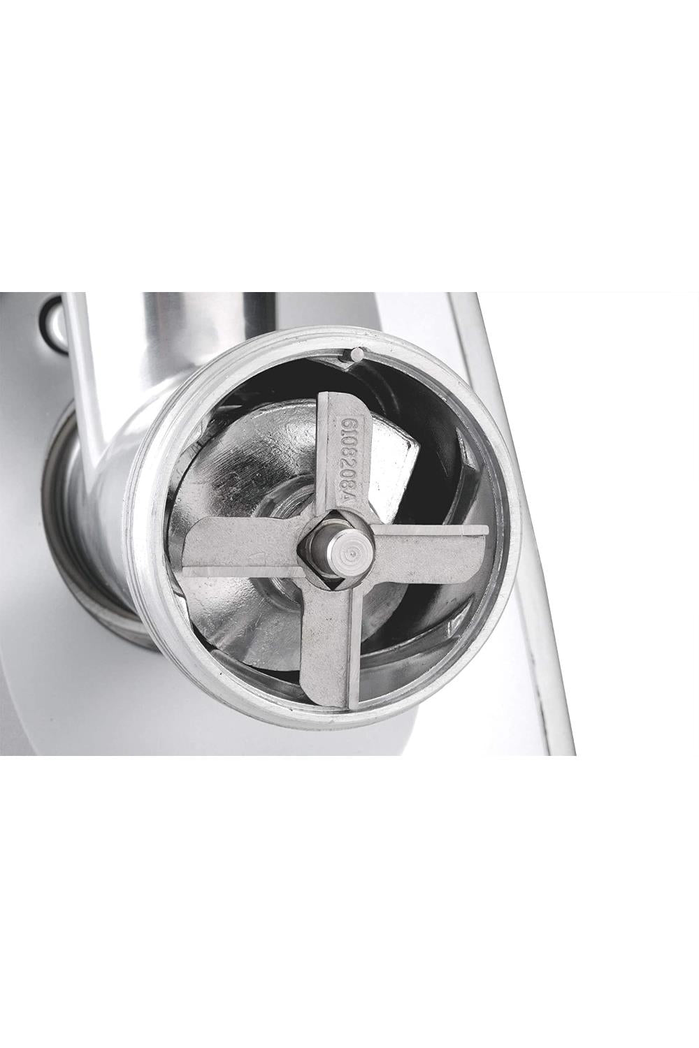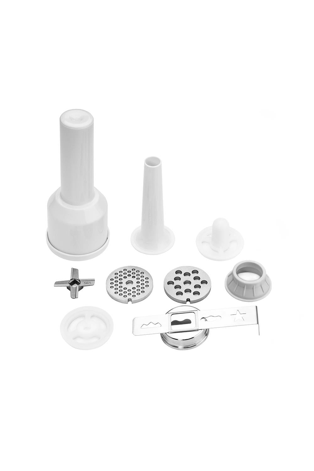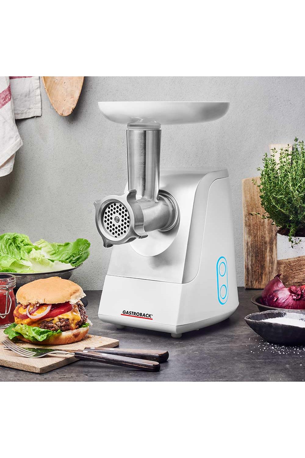 Electronically regulated motor (1500 watt max.). Worm housing made of cast metal. Stainless steel cross-blade knife with 4 blades. LED-illuminated control panel. On/off button and reverse. Grinding disc aperture: 50mm. Including 2 grinding discs for chunky meat, sausage filing attachment, pusher, food tray, cookie attachment, kebbe attachment for oriental cuisine.