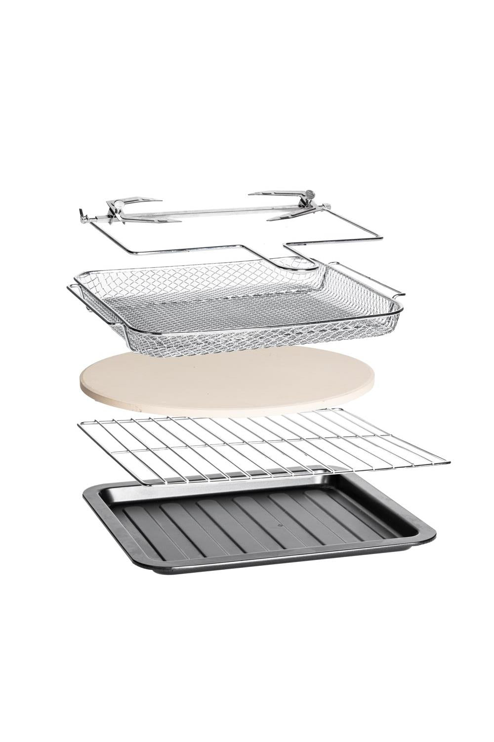 Includes pizza stone, air fry basket, baking tray, grill rack and grill spit