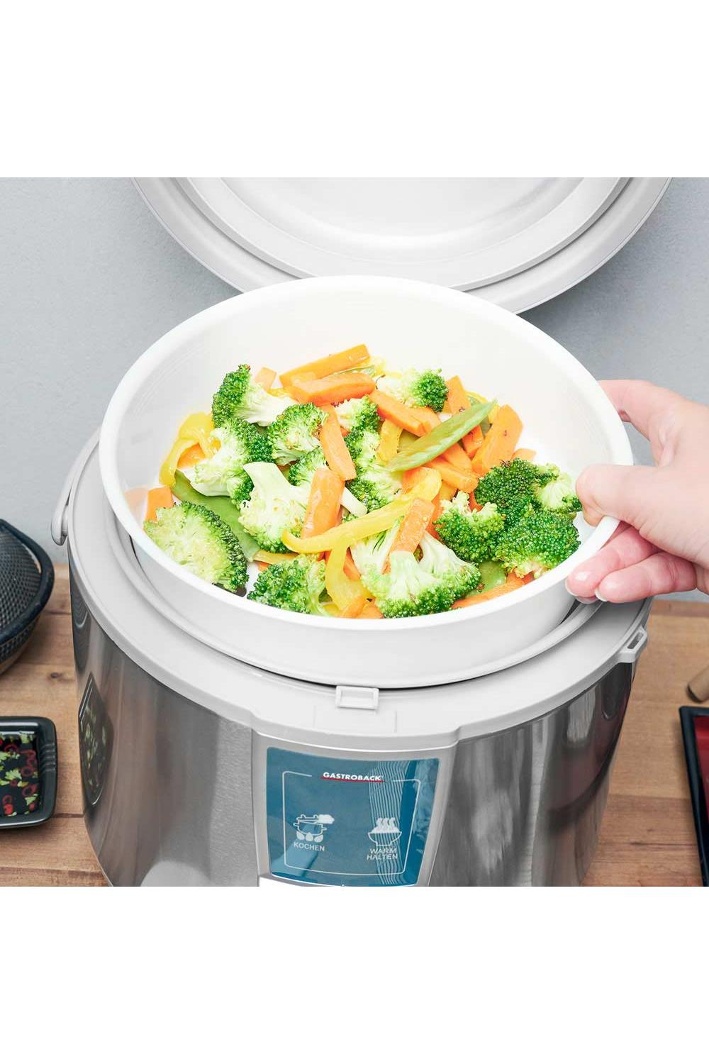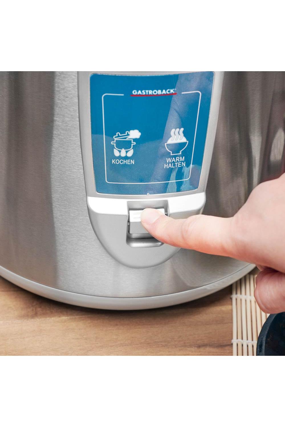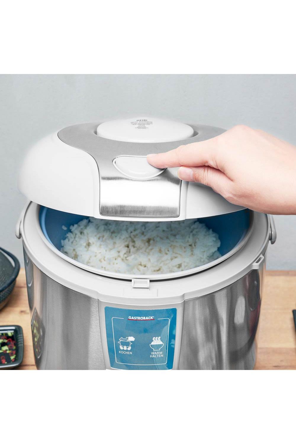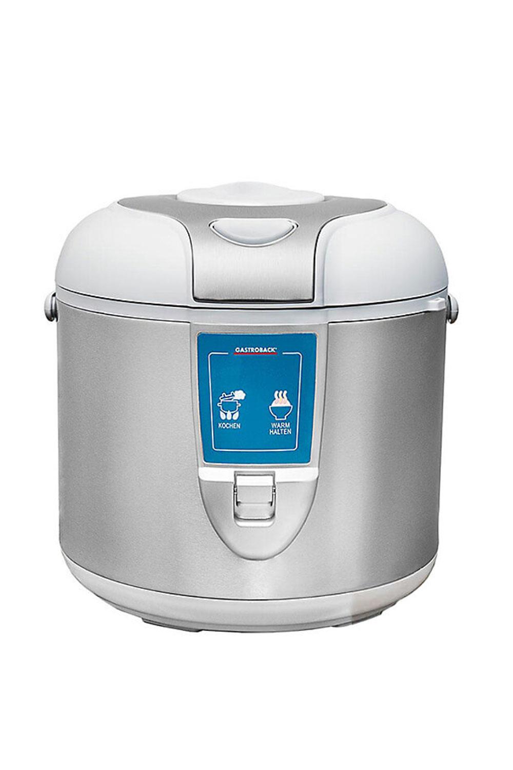 Say goodbye to overcooked or burnt rice with the Gastroback Design Rice Cooker Pro. With a 5 litre capacity and automatic switch-off this machine takes all the guesswork out of cooking rice for perfect results every time. Can also be used to steam vegetables, retaining all of their natural minerals and vitamins. Alternatively use it for heating or keeping soup warm or making porridge. A non-stick coating prevents the rice from sticking to the bowl.Accessories that come with the Design Rice Cooker Pro include a sieve insert, rice spoon and a beaker to measure the amount of rice.The Gastroback Design Rice Cooker Pro is supplied with a 2 year manufacturer's warranty. Gastroback 62518. Power: 650W. AC input voltage: 220 / 230V. AC input frequency: 50Hz Depth: 289 mm. Height: 284 mm. Weight: 4.1 kg. Product dimensions (L x W x H): 289 x 284 x 4100 mm.