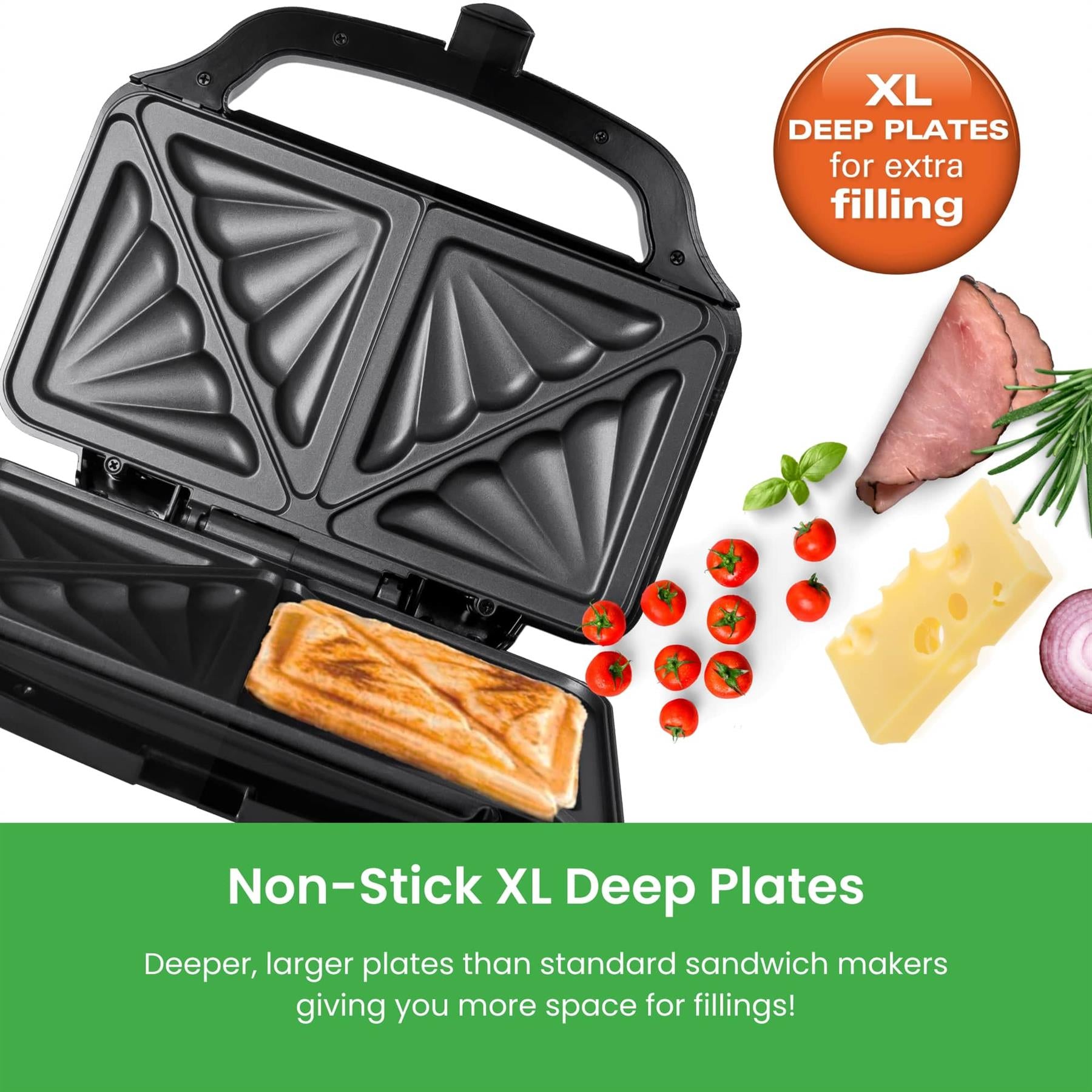 Makes larger, deeper and tastier toasties! Enjoy mess-free, perfectly toasted sandwiches with the Deep Fill Sandwich Toaster. Its deep XL plates accommodate generous fillings without overflowing. The non-stick coating ensures effortless cleaning and prevents sticking or burning. With automatic temperature control and ready light indicators, achieving ideal toasties is a breeze. Designed with safety in mind, it features a cool touch handle, locking latch, and power indicator lights. Upgrade your sandwich-making experience with deeper plates, easy cleaning, and convenient features. Deep XL Plates - deeper, larger plates than standard sandwich makers giving you more space for fillings! Non-Stick - The easy clean non-stick coated plates create tasty snacks with ease. Power Indicator Lights - Notifies you when the optimal temperature has been reached. Cool Touch Handle - Cool touch handle and locking latch for added safety.