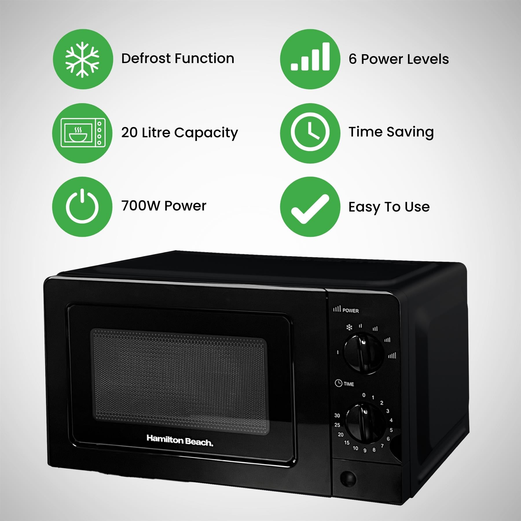 Experience easy cooking with the Hamilton Beach 700W microwave oven. With 6 power levels and a glass turntable for even heating, it's perfect for heating leftovers and defrosting. The manual control panel makes operation simple, and its compact size makes it ideal for small kitchens in apartments, offices, and student accommodations. Enjoy easy cooking with this Hamilton Beach 700W microwave oven. Equipped with 6 power levels, this microwave oven offers precise control over your cooking process. Whether you need to quickly heat up leftovers or defrost frozen dishes, this appliance has got you covered. The glass turntable ensures even heating, guaranteeing that your food is cooked to perfection. Operating this microwave oven is a breeze, thanks to its easy-to-use this microwave oven simplifies your cooking process.The compact size makes it ideal for kitchens with limited space like, apartments, offices and student accommodation. Fitting seamlessly in any kitchen!