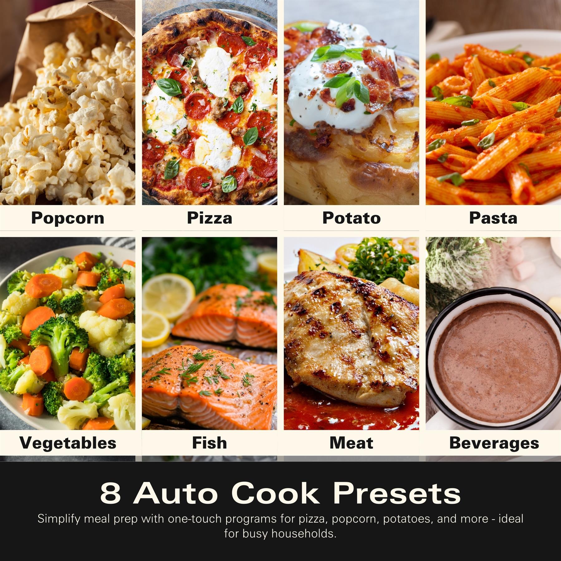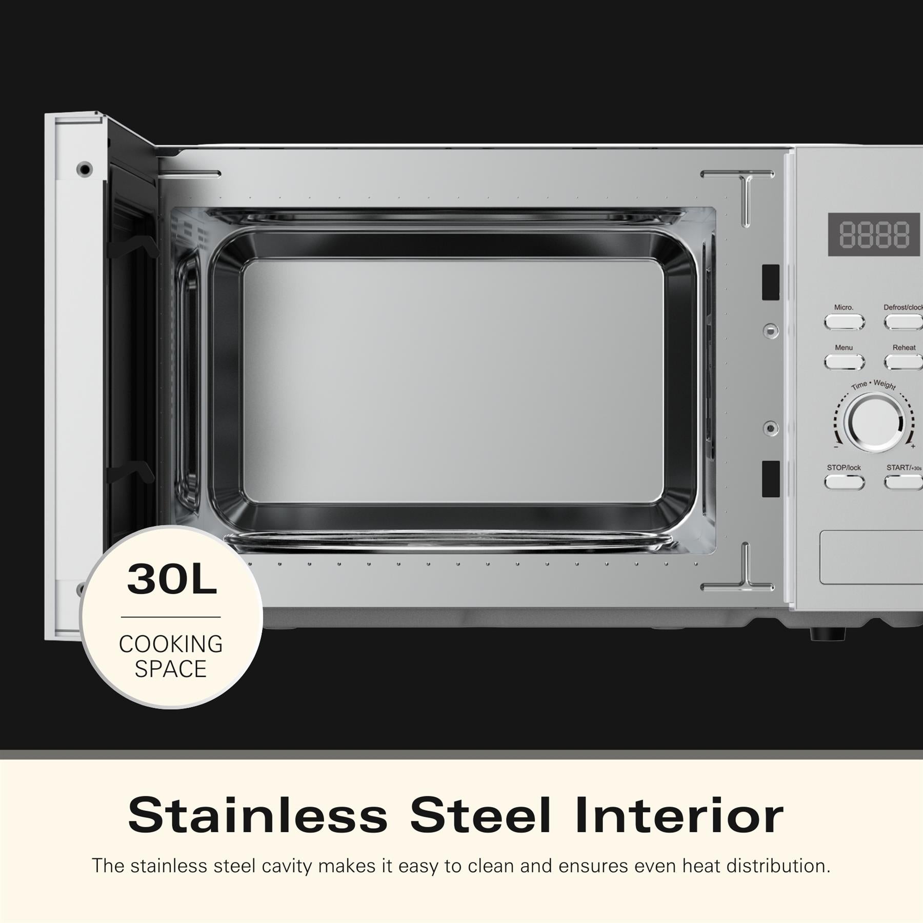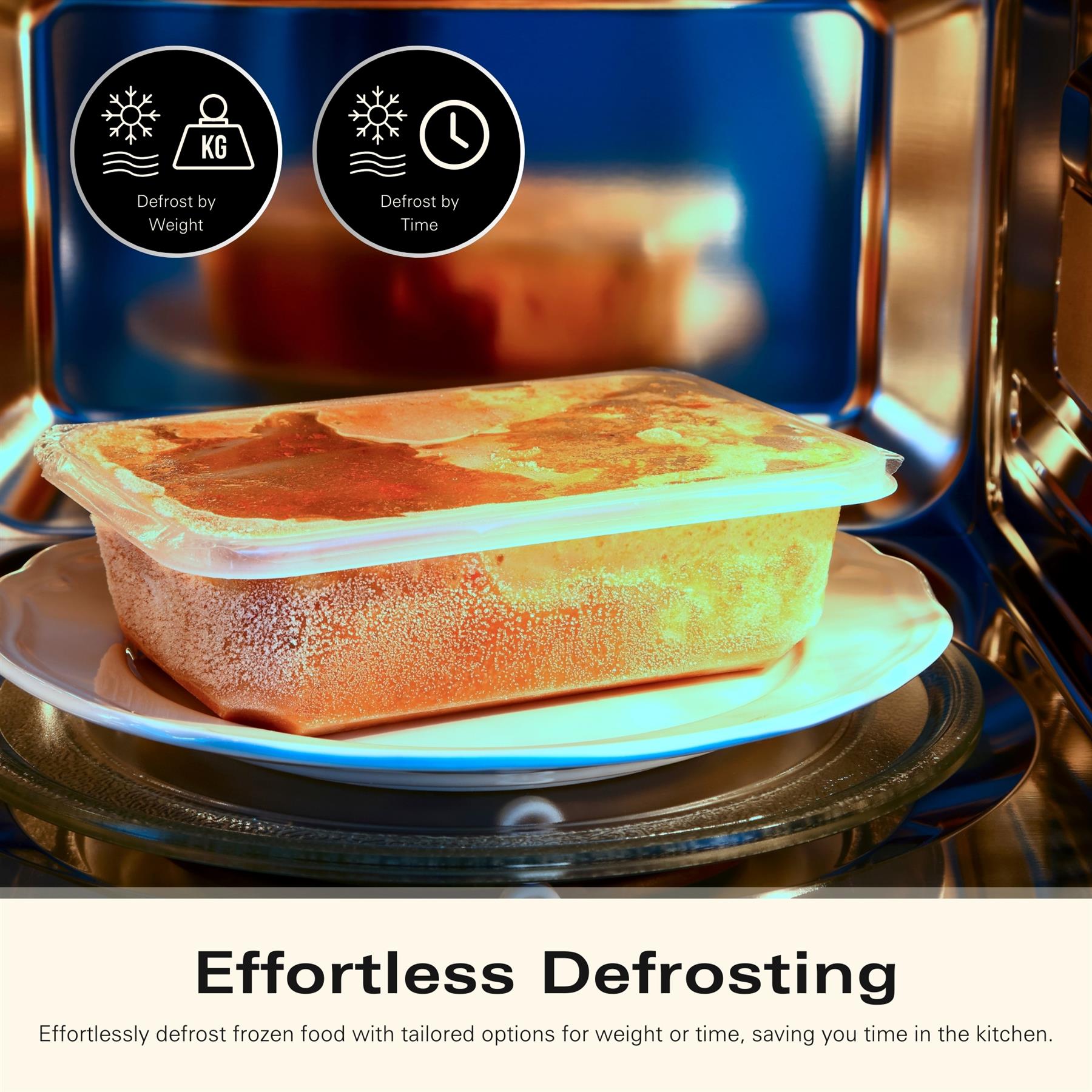 With a powerful 950W cooking capability and 5 microwave power levels, it ensures speedy cooking. Accommodating large dinner plates comfortably, its generous 30-litre capacity is ideal for family meals. Featuring 8 pre-programmed auto cook menus, including pizza, potato, and popcorn, you can effortlessly prepare your favourite dishes with just the touch of a button.