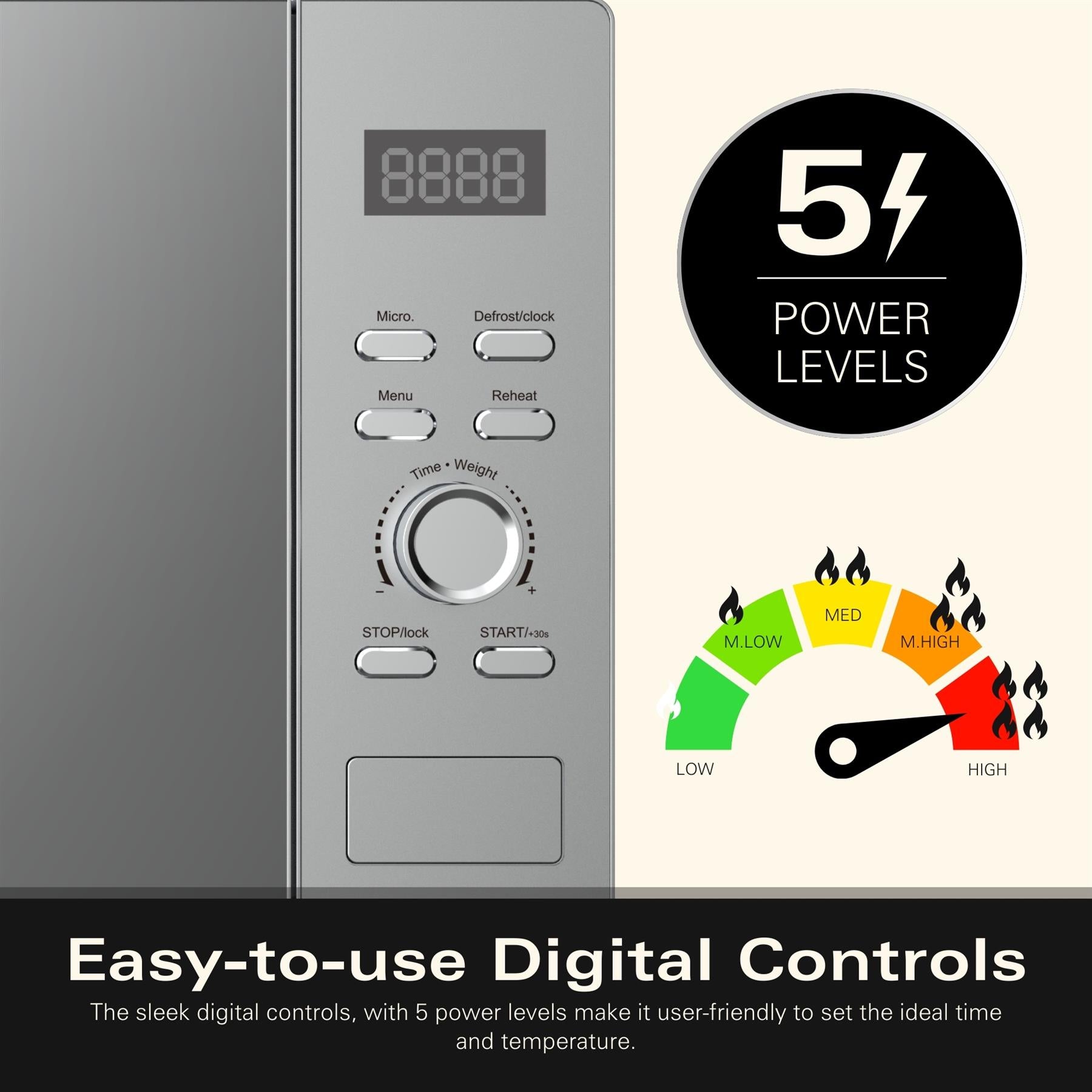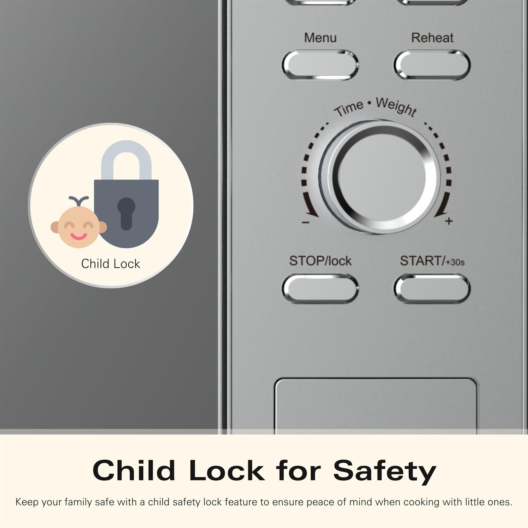 Defrosting dishes by weight or time adds convenience, allowing you to enjoy frozen meals with ease. Additional features include a handy digital clock and count-down timer. For added peace of mind, the microwave offers peace of mind with its child safety lock, preventing accidental activation by locking the buttons.