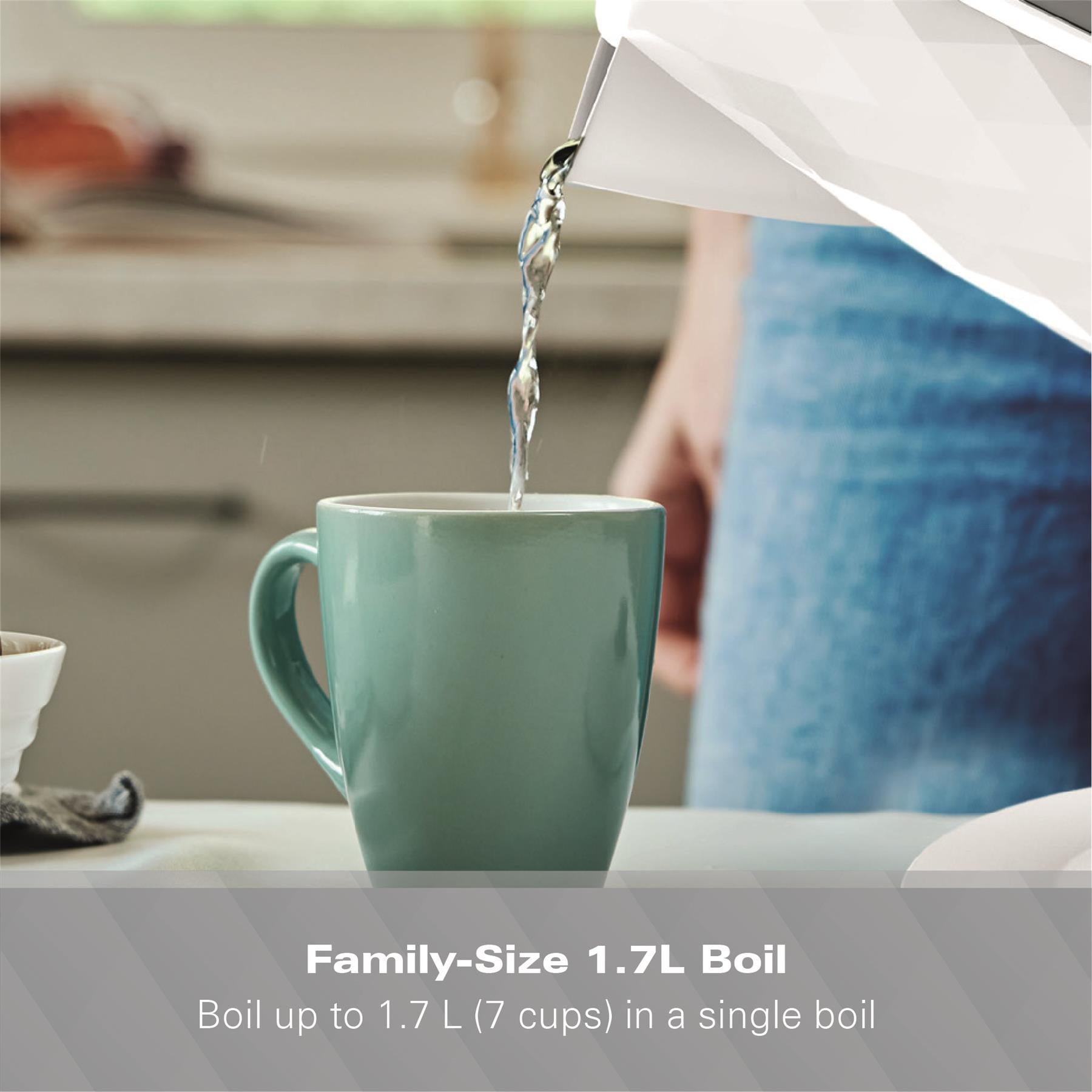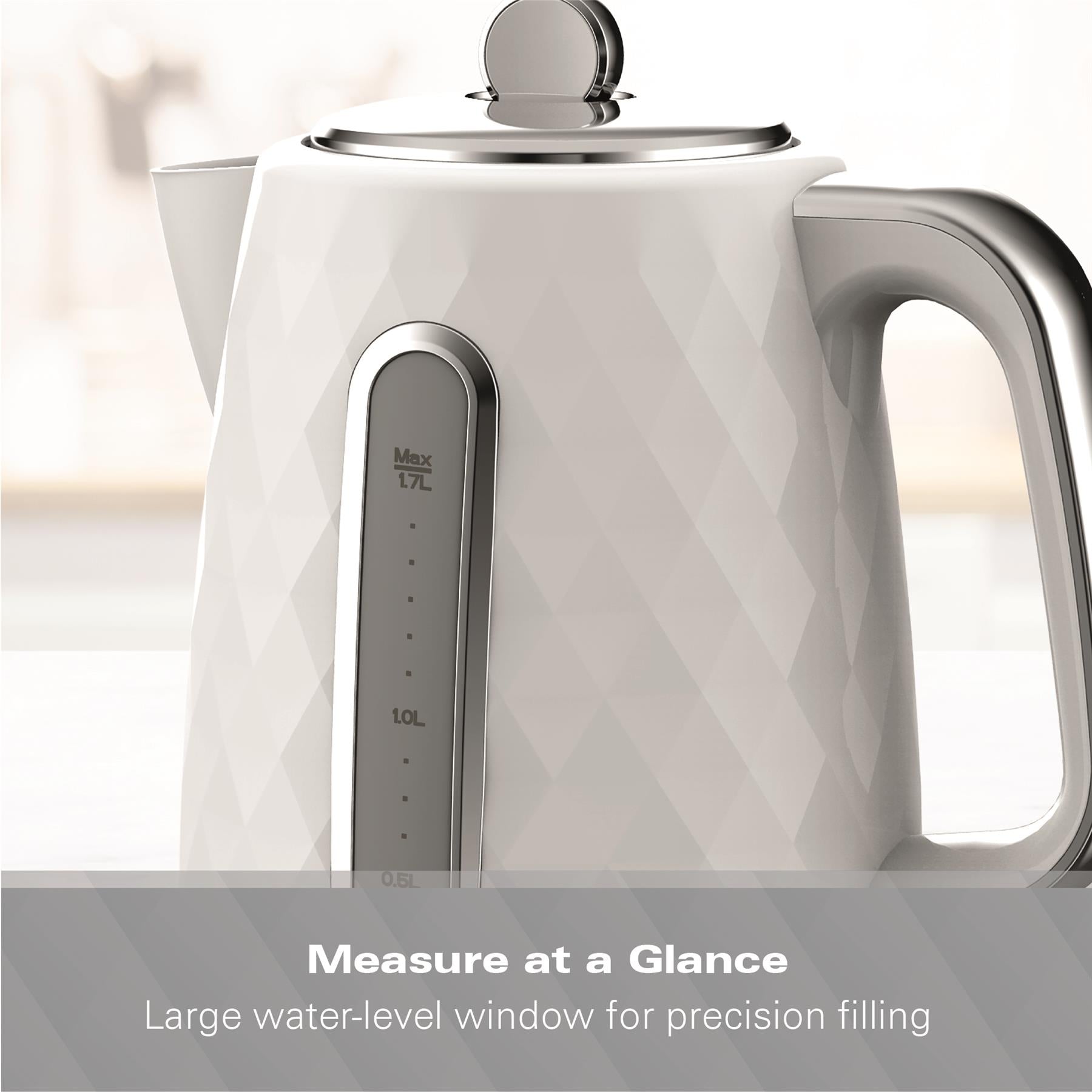 Transform your kitchen with our 1.7L Textured Kettle, a perfect blend of style and functionality. With a generous 1.7L capacity, it boils up to 7 cups of water at once—ideal for family gatherings, tea parties, or hosting friends. The kettle's sleek diamond-textured body, complemented by chrome accents, adds a touch of modern elegance to any countertop. Equipped with boil-dry safety protection and an on/off indicator light, it ensures peace of mind with every use. The easy-to-read water window lets you effortlessly check the water level, while built-in cord storage keeps your kitchen neat and tidy. Whether you're brewing a hot cup of tea or preparing for a larger gathering, this kettle combines convenience, style, and safety in one sleek design.