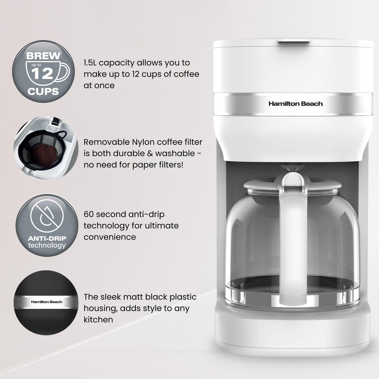 Hamilton Beach Ella 1.5L Matte White Filter Coffee Machine