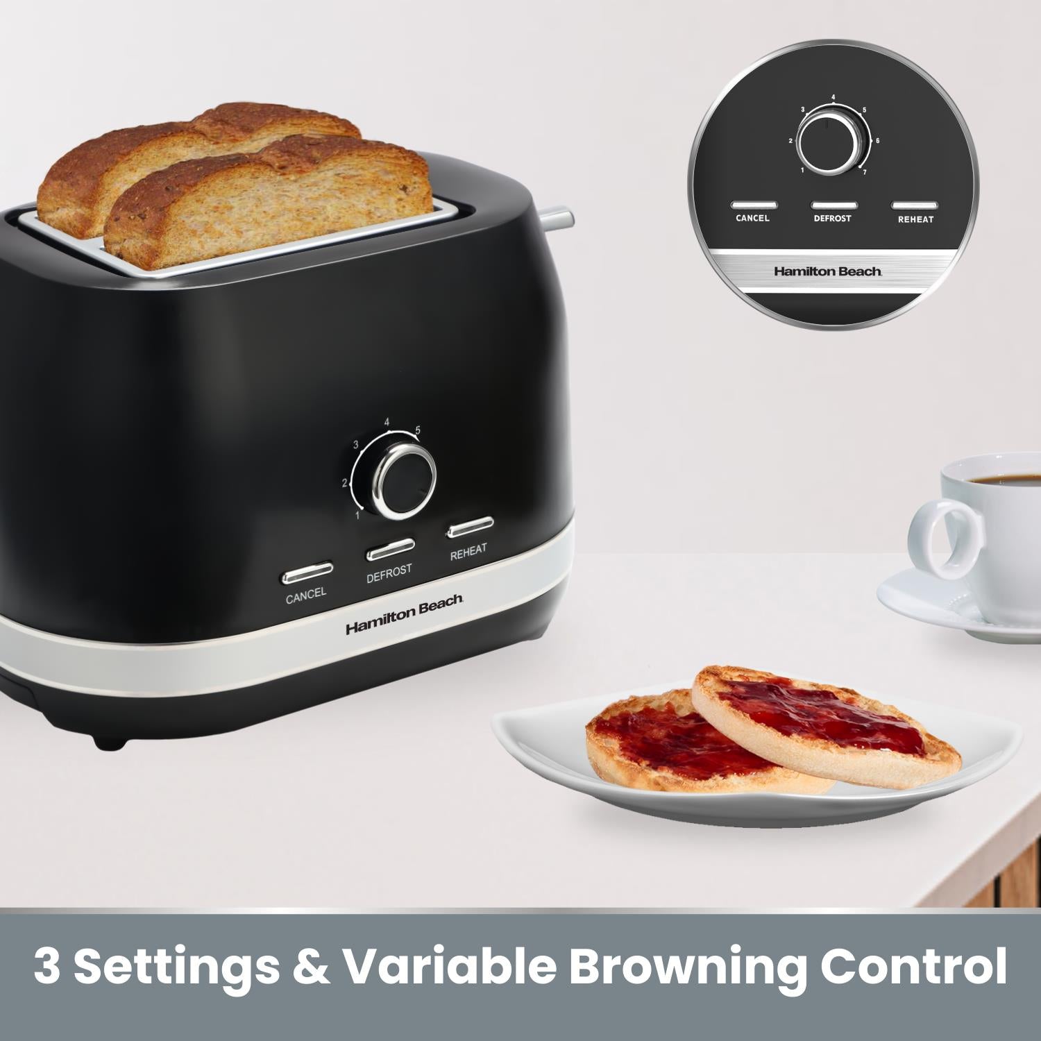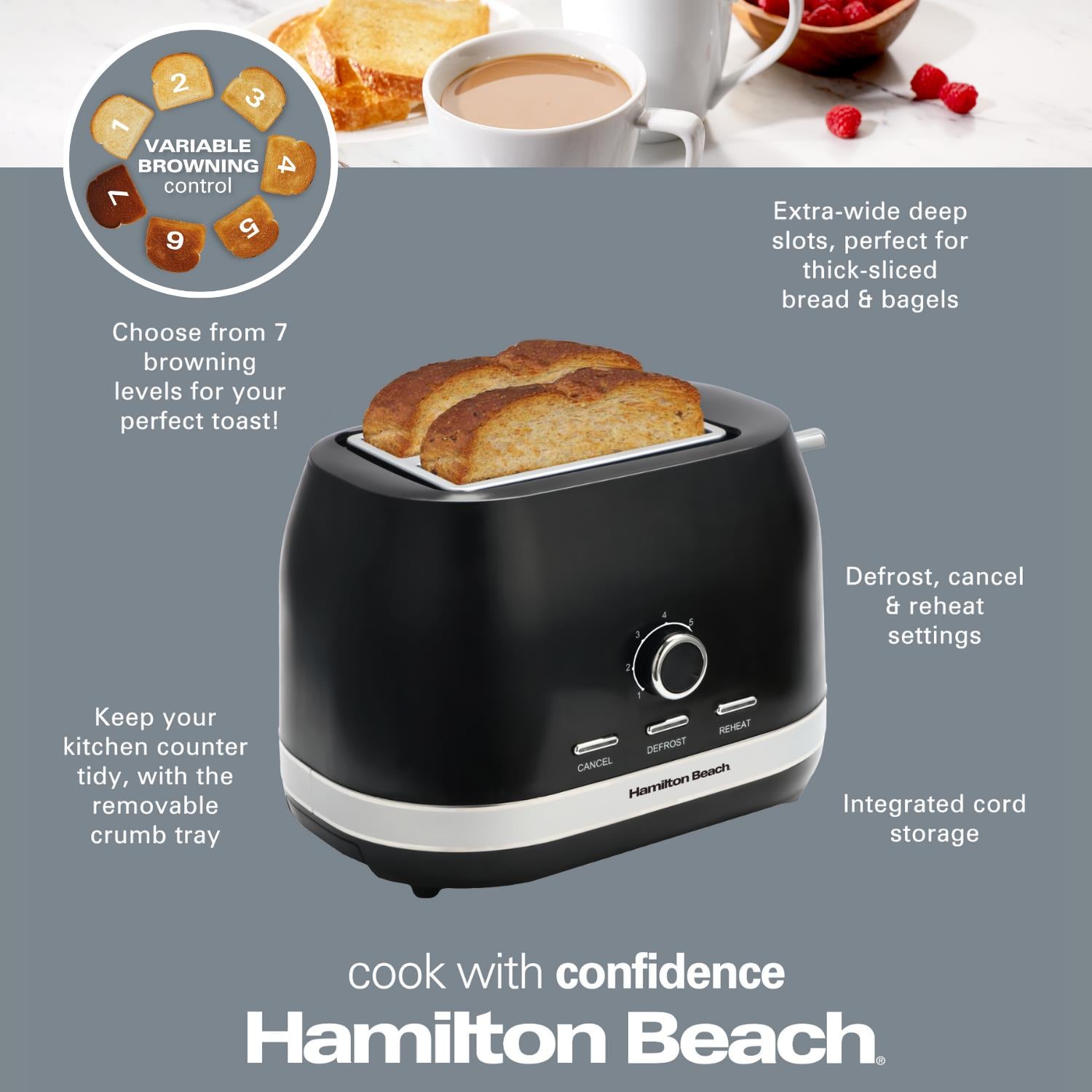 Discover the Hamilton Beach Ella 2-Slice Toaster, the perfect addition to your kitchen for precise and stylish toasting. With 7 variable browning levels, choose your perfect toast effortlessly. The removable crumb tray and integrated cord storage ensure easy cleaning and a tidy workspace. Enjoy even and crisp toasting with 800W power, and the wide slots are ideal for thick-sliced bread and bagels. The modern design, featuring sleek matte black plastic housing, adds a stylish touch to any kitchen. Benefit from the convenient defrost, cancel and reheat settings.