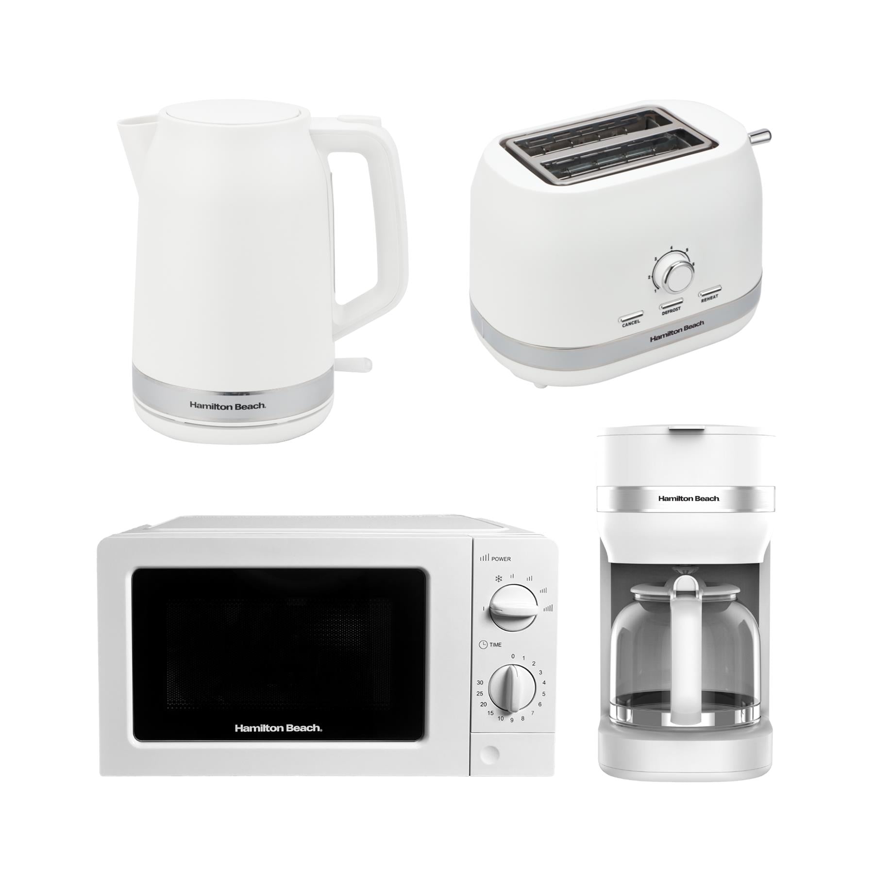 The Hamilton Beach Ella White Kitchen Bundle with Coffee includes: Ella 1.7L White Kettle, Ella 2 Slice White Toaster, Ella 1.5L White Filter Coffee Machine and 20L White Standard Microwave.
