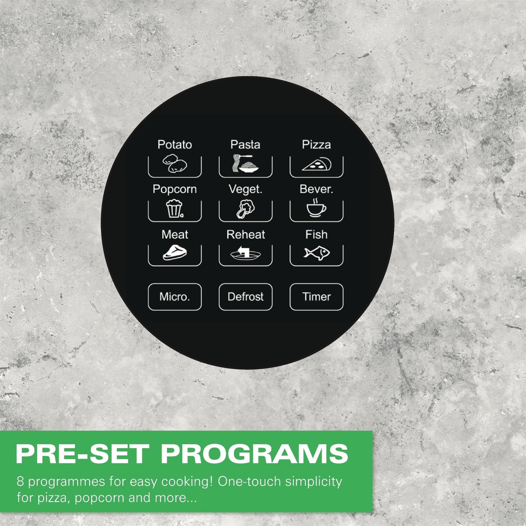 - Customised Options: Customise your cooking with 10 power levels to tailor the microwave to your cooking needs. Choose from 8 Presets: Potato, Pasta, Pizza, Popcorn, Vegetables, Beverage, Meat and Fish to customise your microwave to the food you wish to cook.