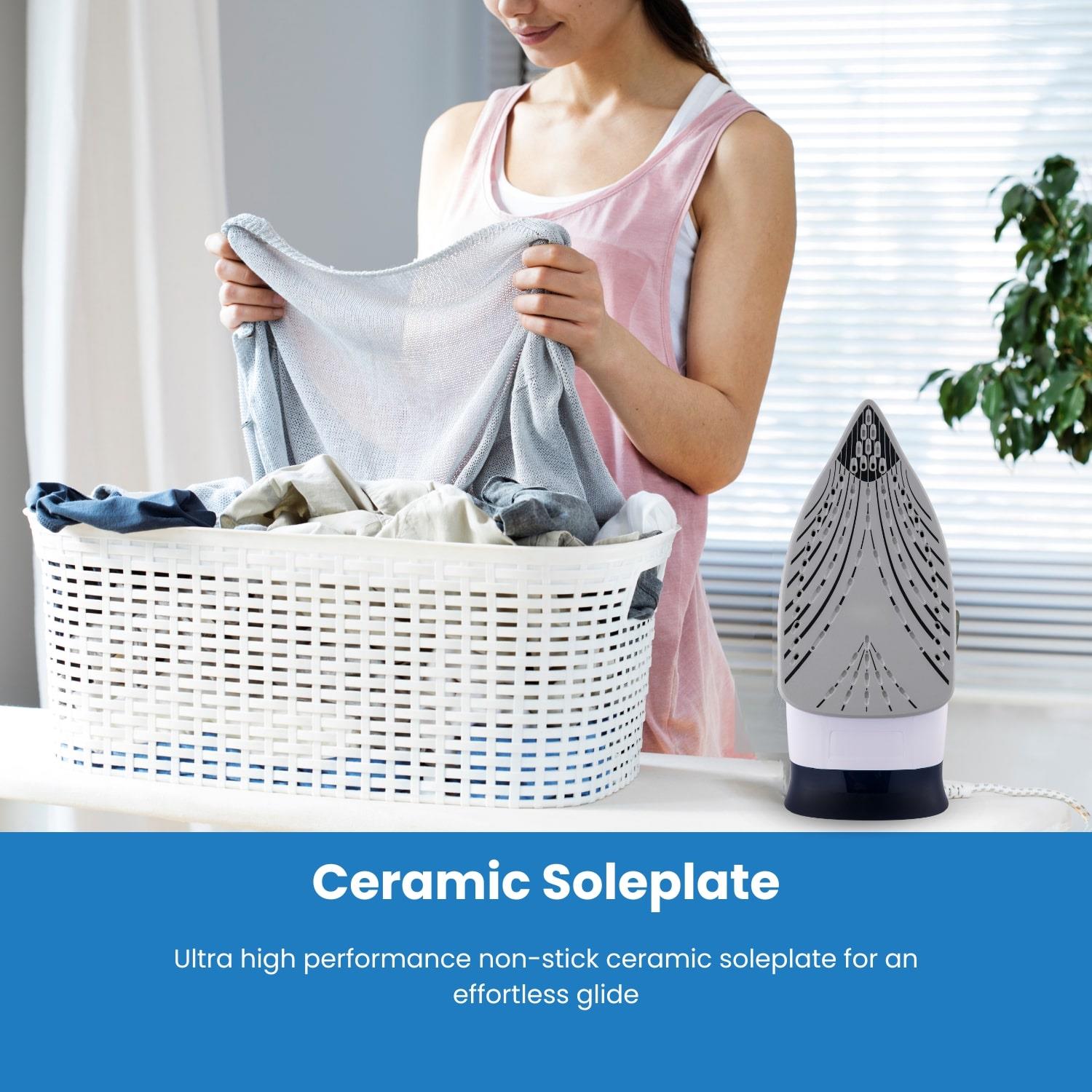 Experience efficient crease removal like never before with the super powerful steam shot, delivering up to 35g/min of steam. Say goodbye to stubborn wrinkles as this iron effortlessly tackles even the toughest creases. The ultra high-performance non-stick ceramic soleplate ensures an effortless glide over fabrics, making ironing a breeze. No more snagging or sticking! Achieve versatile ironing results with the choice between dry or steam ironing. For those stubborn creases, simply use the steam and spritz function to effortlessly remove them, leaving your garments looking fresh and wrinkle-free. Need to tackle curtains or hanging clothes? The Pro SteamMax’s vertical steam feature is here to help. With a generous 1.9m cord, you can easily reach every corner and achieve perfectly ironed curtains or hanging garments. We care about your comfort. That’s why our iron is designed with ergonomic features. The steam and water triggers are within easy reach, ensuring ultimate comfort and convenience during your ironing sessions.We understand the importance of convenience. Our iron features an easy-fill water tank, allowing for hassle-free refills. Additionally, the self-cleaning feature keeps maintenance simple and effortless. Super Powerful – Up to 35g/min steam shot perfect for efficient crease removal. Ceramic Soleplate – Ultra high performance non-stick ceramic soleplate for an effortless glide. Versatile Ironing – Select from dry or steam ironing — use steam and spritz function to remove stubborn creases. Vertical Steam – Tackles the toughest creases on curtains or hanging clothes easily with 1.9m cord. Ergonomic Features – For ultimate comfort the steam and water trigger are within easy reach. Convenient Design – Easy-fill water tank and self cleaning feature four convenience.